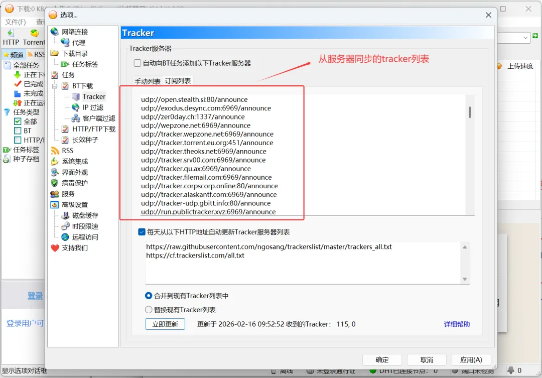 接着点击“立即更新”,等待一会后便会将对应服务器的tracker列表填充到订阅列表中:
