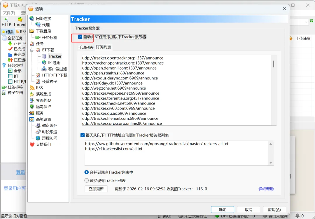 当然,最后还需勾选“自动向BT任务添加以下Tracker服务器”,从而在下载资源时自动使用订阅的tracker列表: