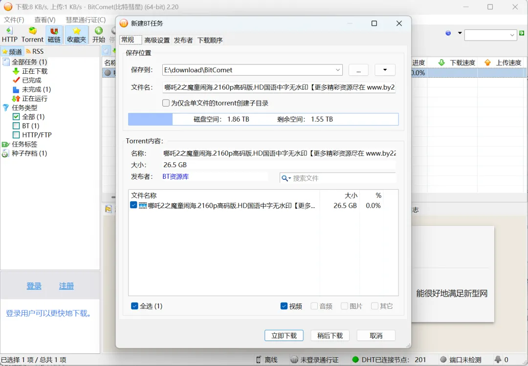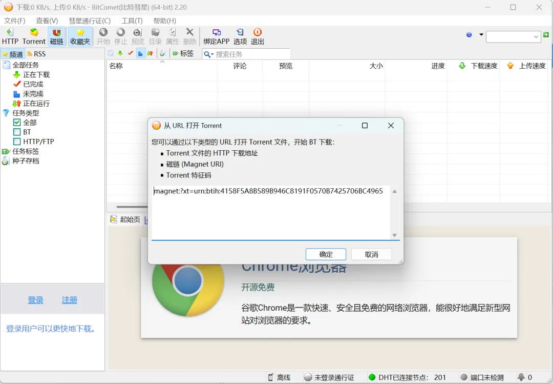 接着将下方的磁力链接拷贝到BitComet 中并创建对应的下载任务: