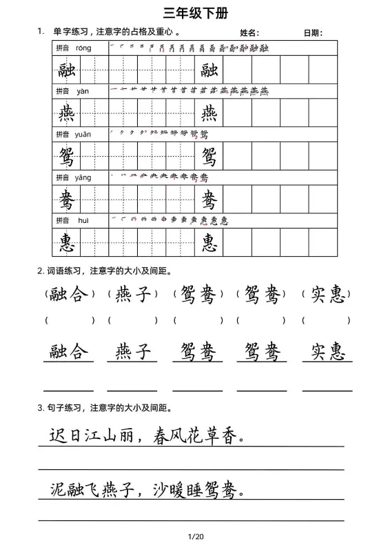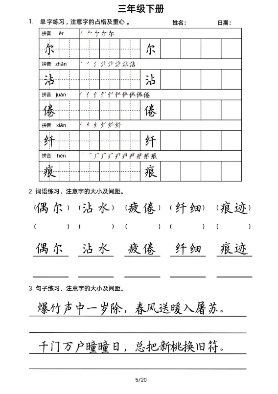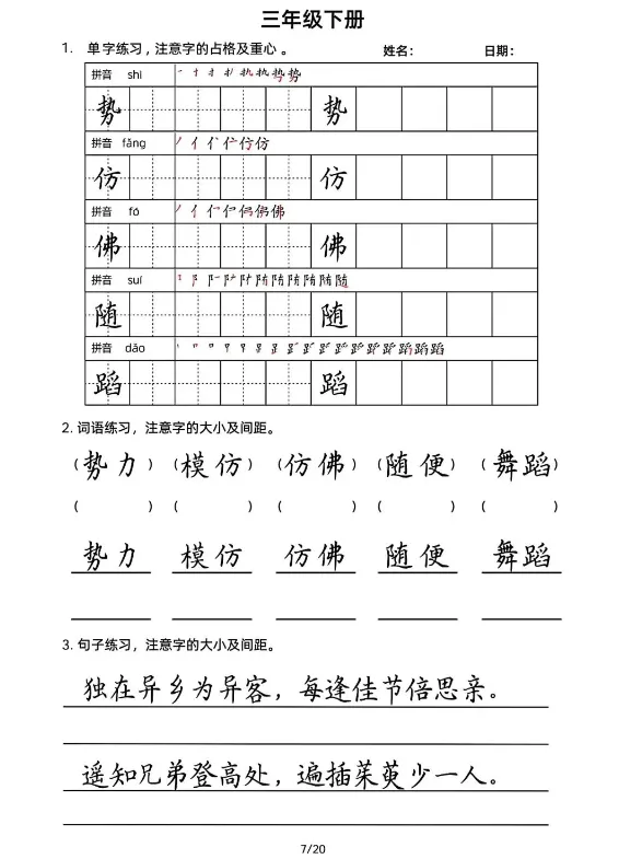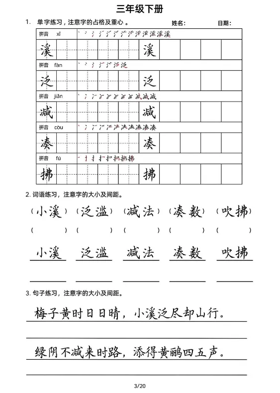 三年级下册书写20天,电子版可打印