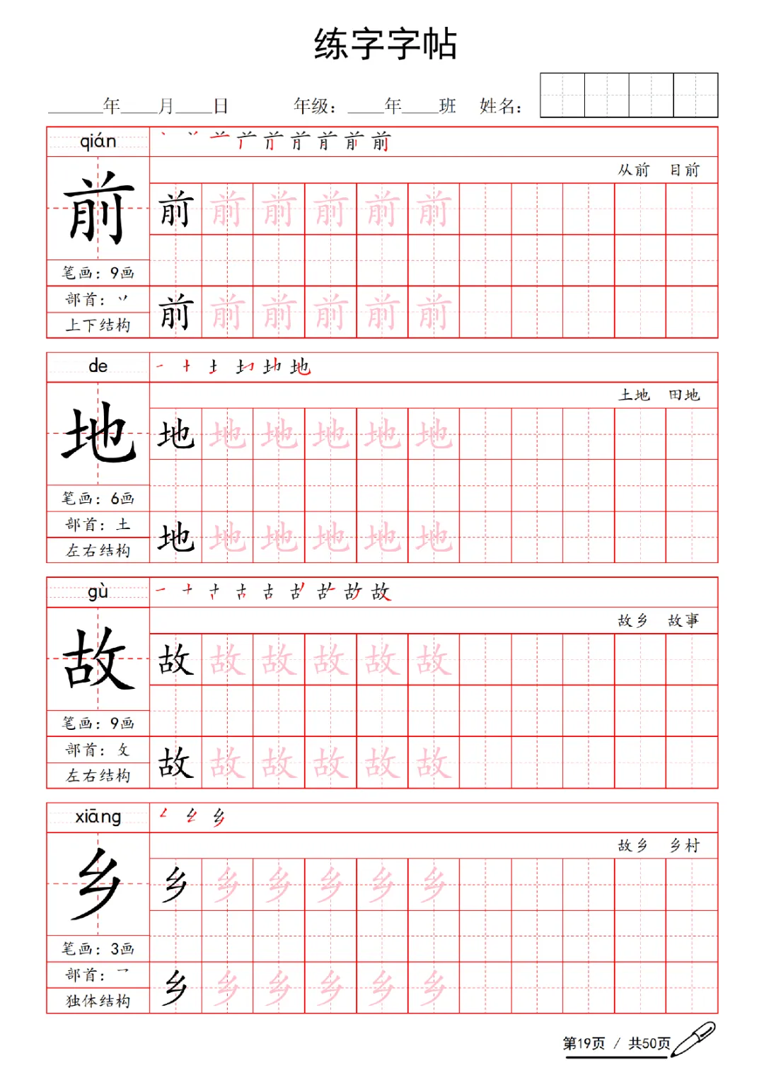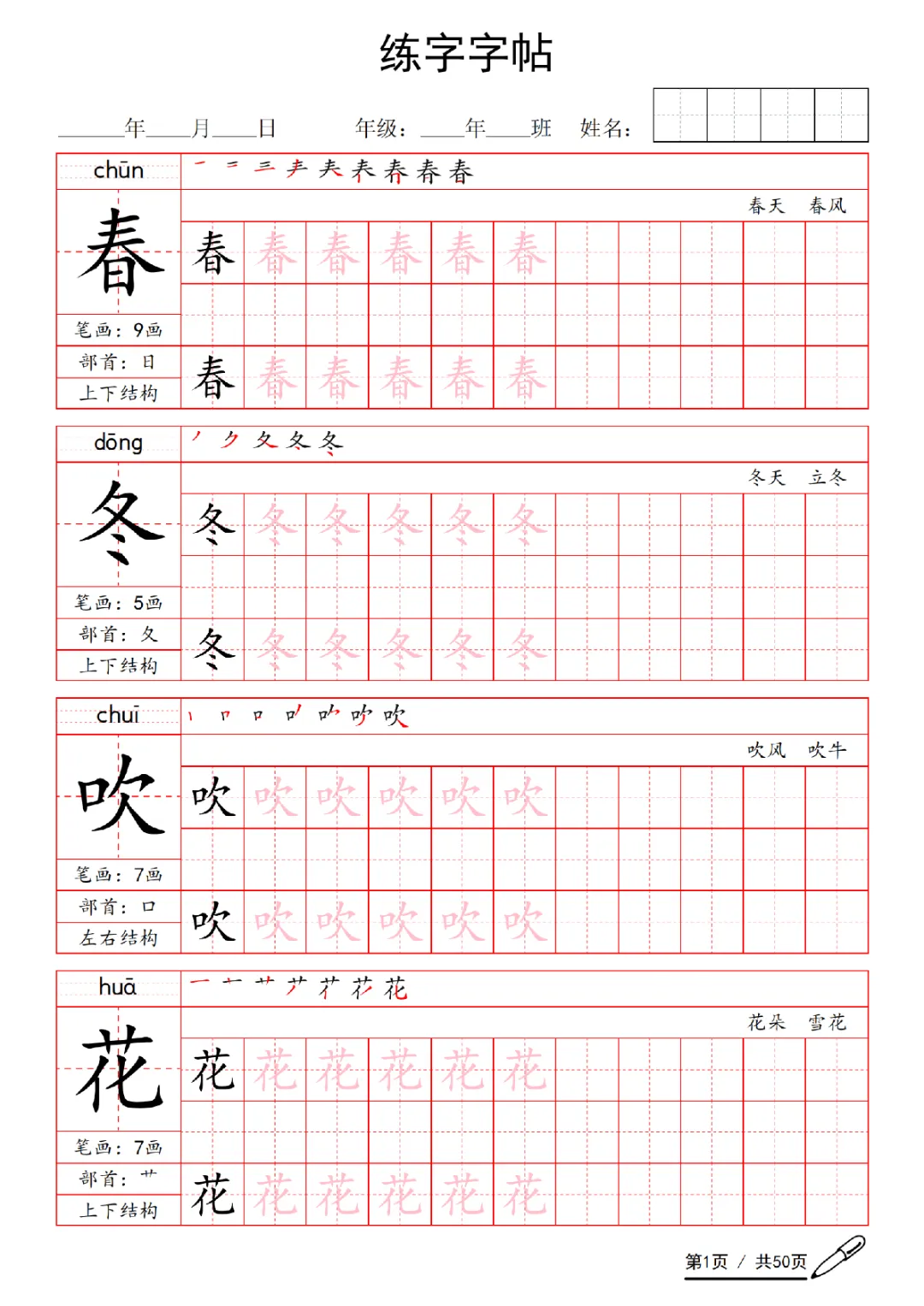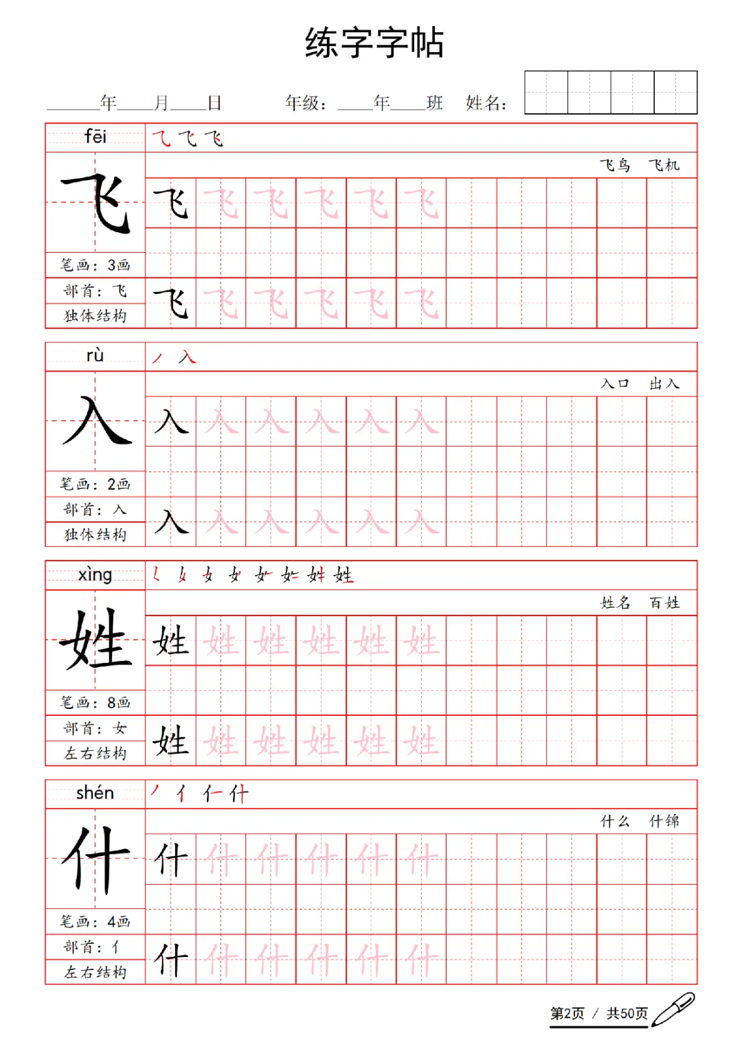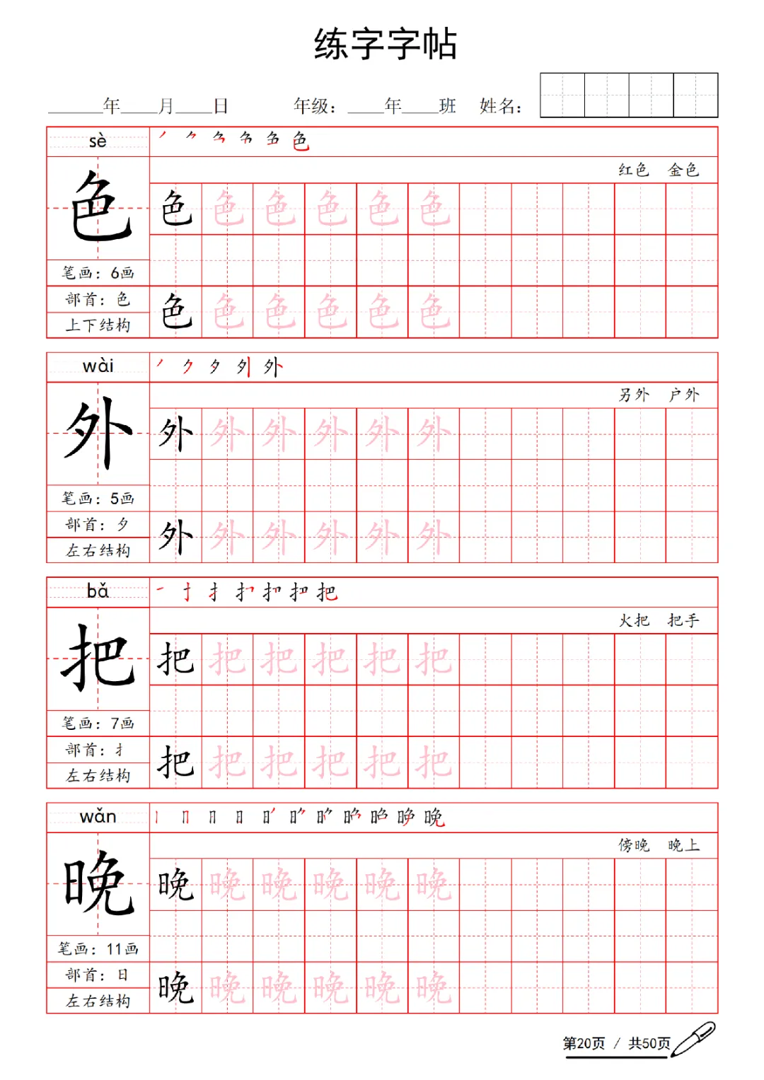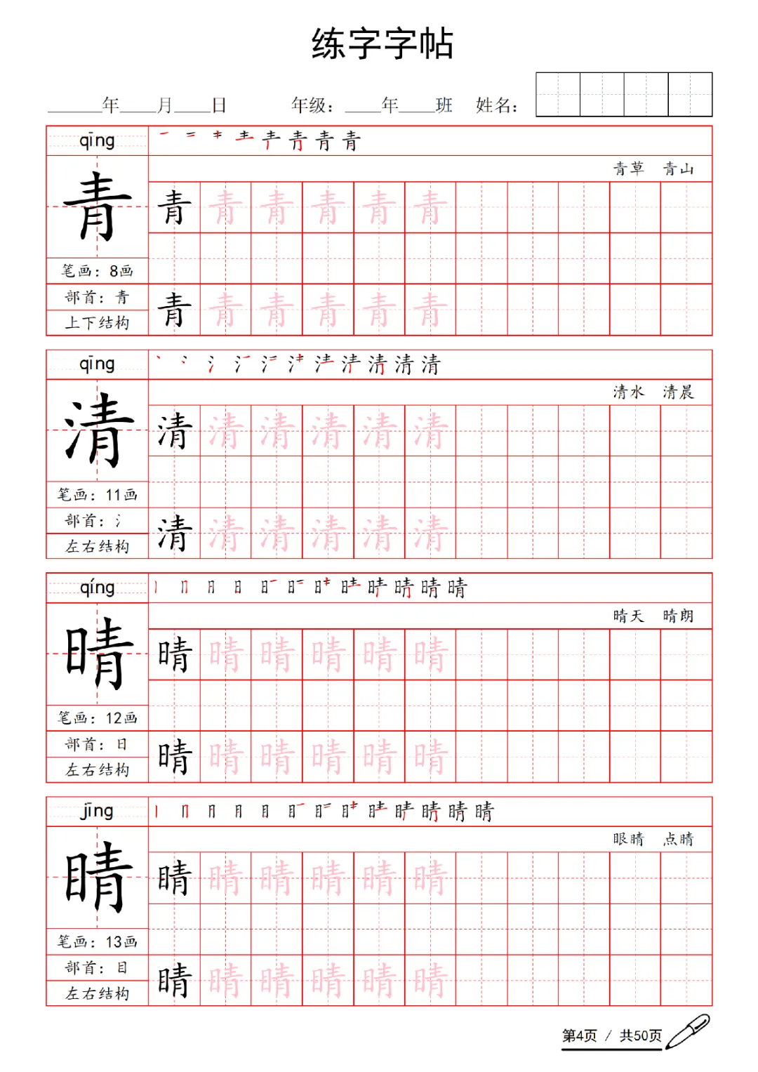 2026年一年级下册语文练字字帖(电子版可打印)
