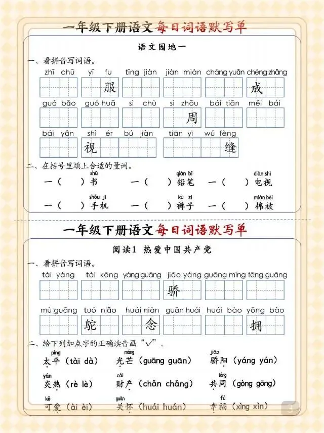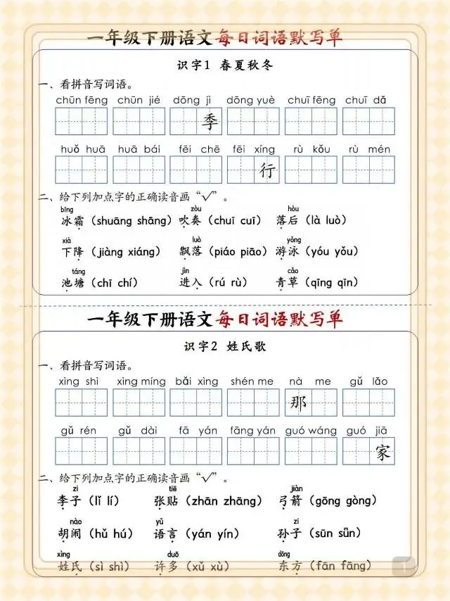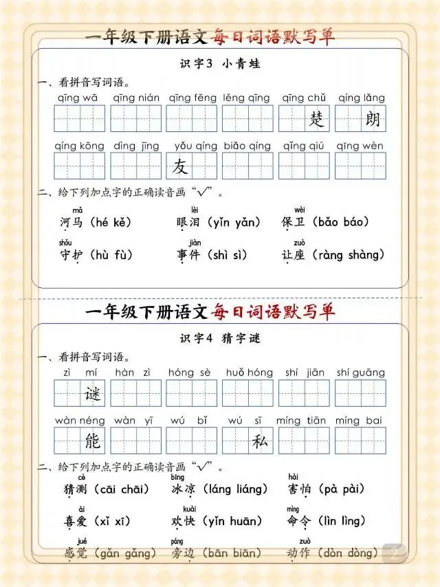 一年级下语文《每日词语默写单》,电子版可打印