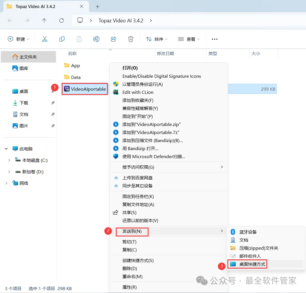 安装需知[软件名称]:Topaz Video AI 3.4.2[软件大小]:656MB[软件语言]:中文简体[安装环境]:Win7及以上版本[下载地址]:公众号内回复:VideoAI[不限速下载]:免费获取百度网盘不限速下载工具。公众号内回复:不限速[注意事项]:安装前请关闭网络、杀毒软件和防火墙,否则易安装失败。公众号内回复:1[解压软件]:小编用的解压软件是Bandizip,获取Bandizip软件安装包。公众号内回复:2安装教程1、下载Topaz Video AI 3.4.2软件安装包到电脑上,右键选择【解压到Topaz Video AI 3.4.2\】2、右键【打开】解压后的文件夹3、找到【VideoAIportable】应用程序,右键选择【以管理员身份运行】它4、点击右上角【关闭按钮】5、找到【VideoAIportable】应用程序,右键依次点击【显示更多选项】、【发送到】、【桌面快捷方式】,完成软件桌面快捷方式的创建6、回到桌面,右键桌面上的【VideoAIportable软件图标】,点击【打开】7、软件打开成功,运行界面如下:8、以上就是Topaz Video AI 3.4.2软件安装的全过程,要是对你有帮助的话,请为小编点个赞!免责声明:软件资源均来源于网络,仅供用户交流学习与研究使用,版权归属原版权方所有,版权争议与本公众号无关,用户本人下载后不能用作商业或非法用途,否则后果均由用户承担责任;如果您访问和下载此文件,表示您同意只将此软件用于参考、学习而非其他用途,否则一切后果请您自行承担,请于下载后24小时内删除,不允许用于商业用途,否则法律问题自行承担。如果您喜欢该软件,请支持正版软件,购买注册,得到更好的正版服务。