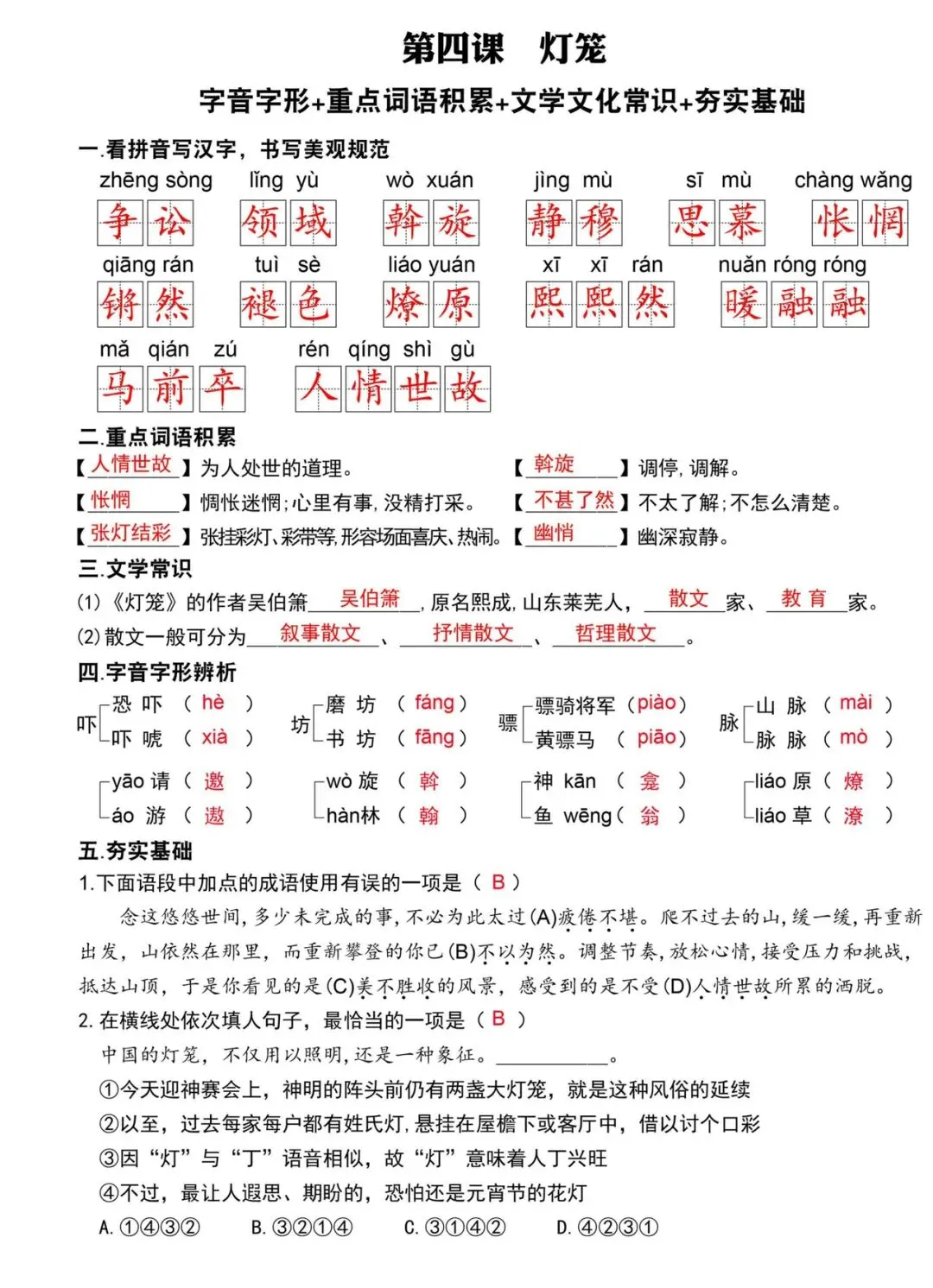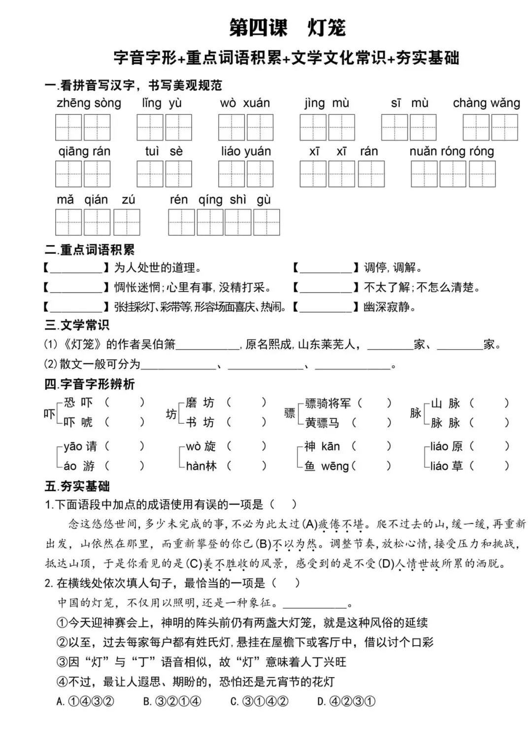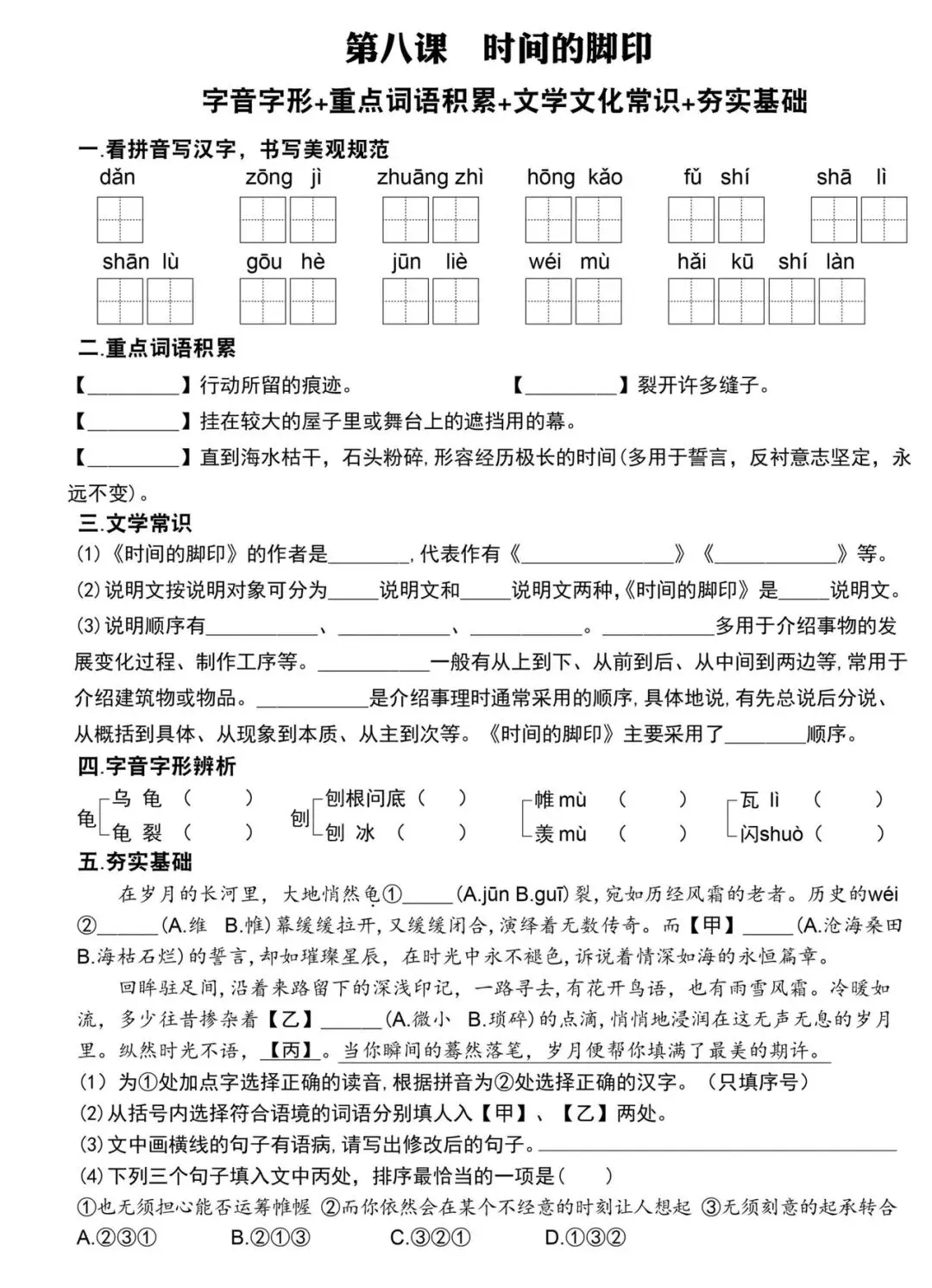 - 这份资料全维度基础巩固资料,专为初中语文学习设计整体内容紧扣教材,兼顾知识积累与能力提升,适合作为课前预习、课后复习或单元检测的实用资料。
