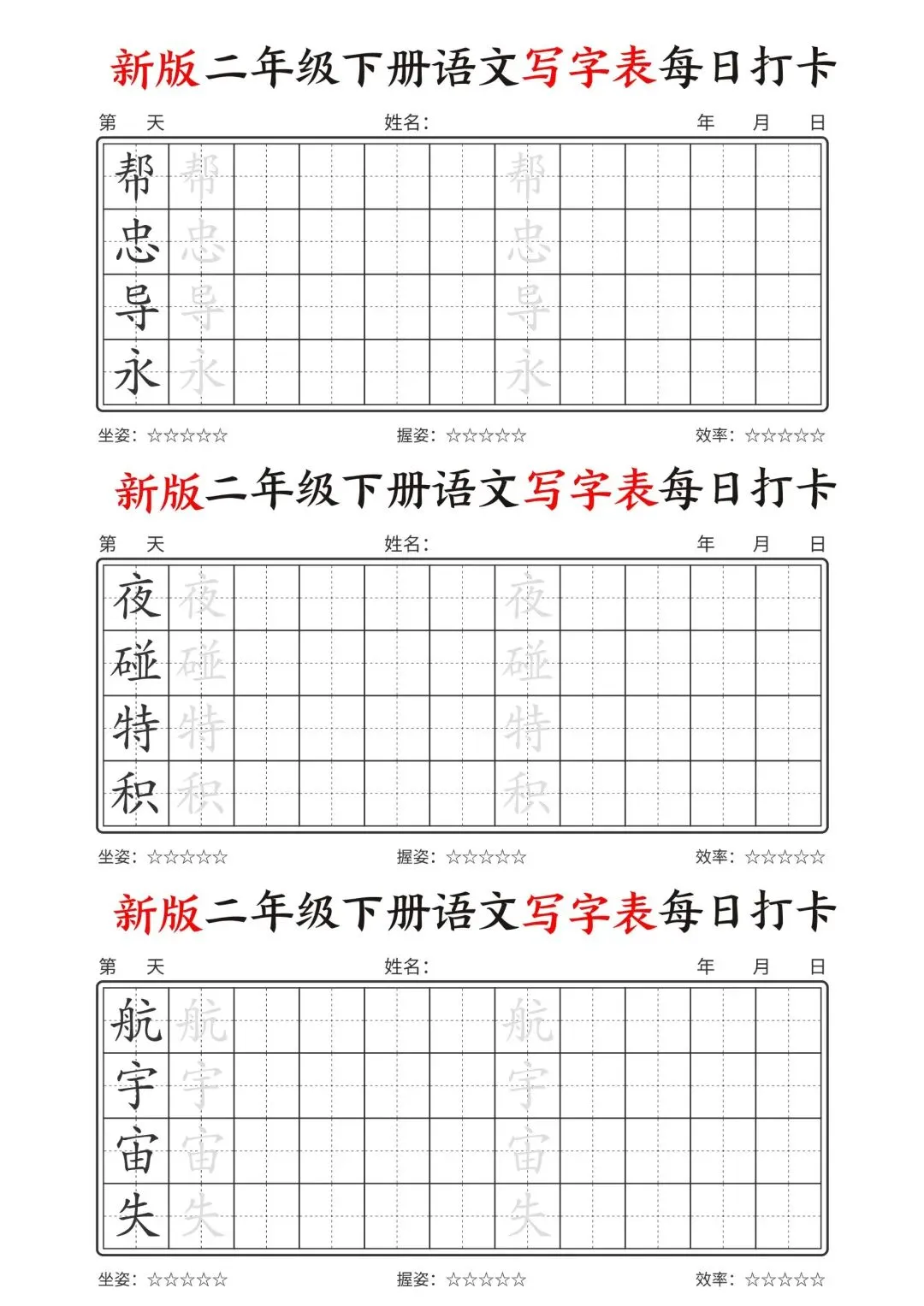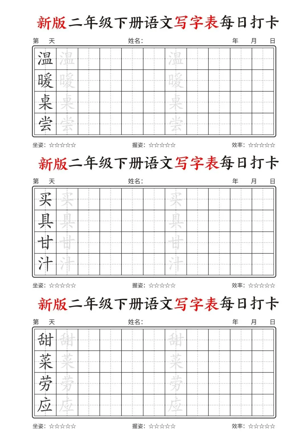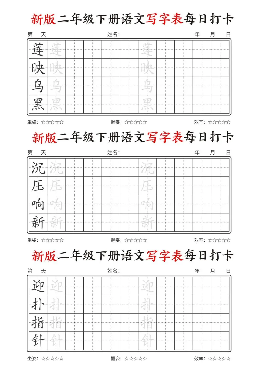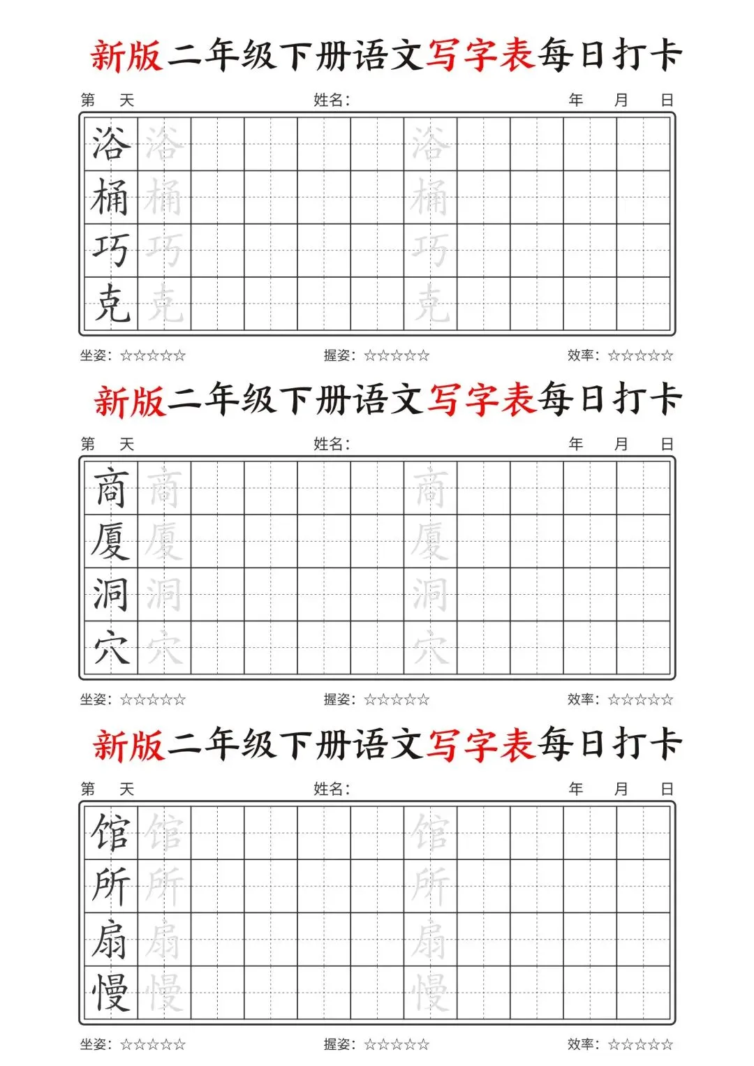 新版二年级下册语文写字表每日打卡,电子版可下载免费