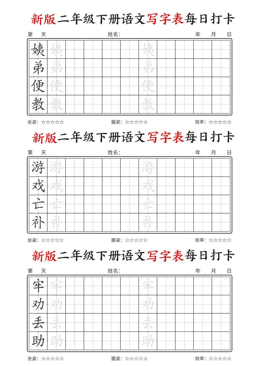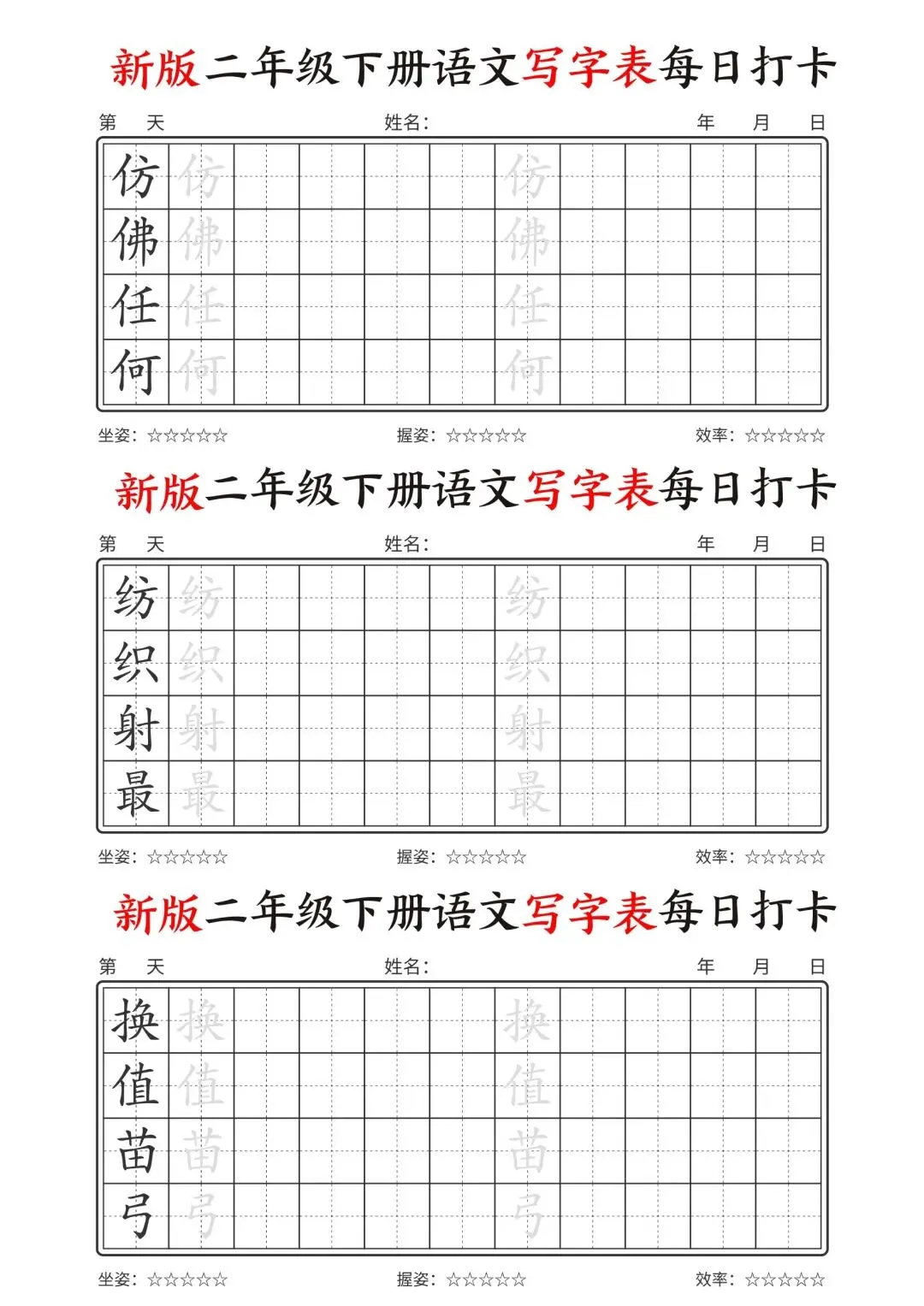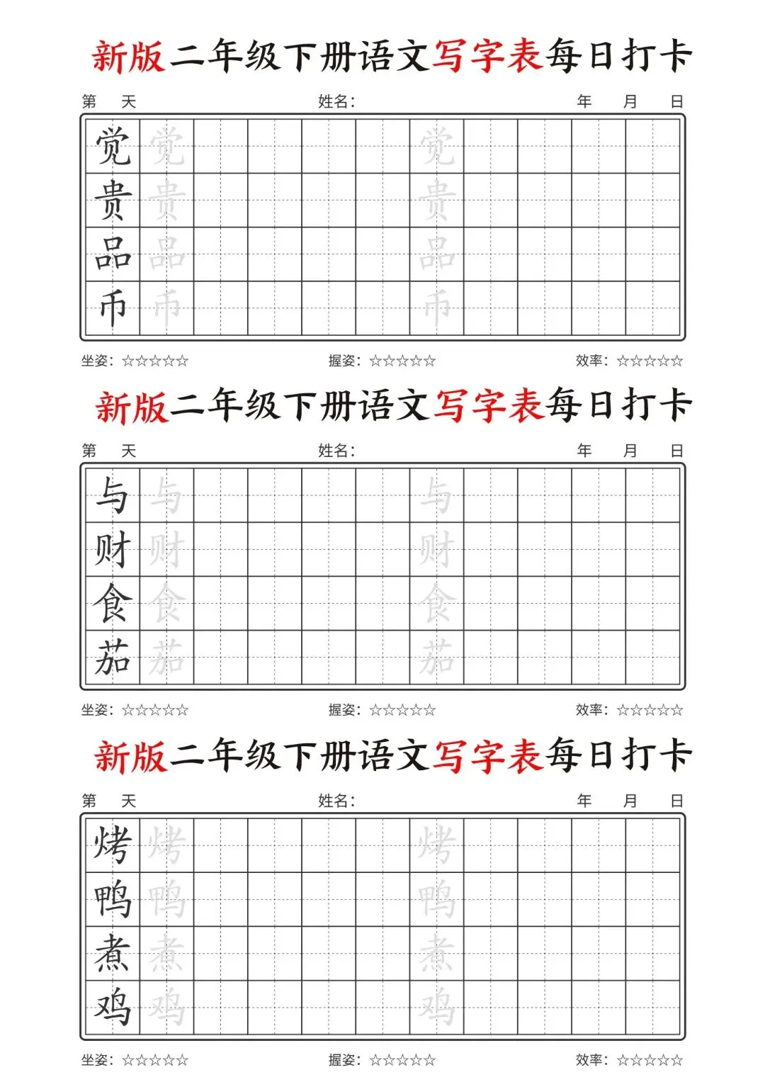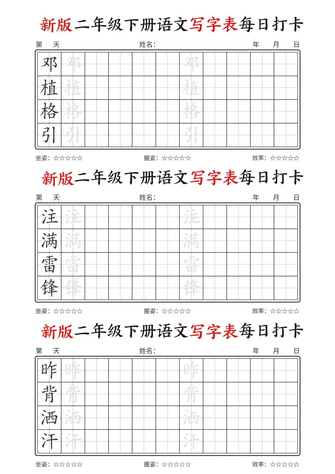 新版二年级下册语文写字表每日打卡,电子版可下载免费