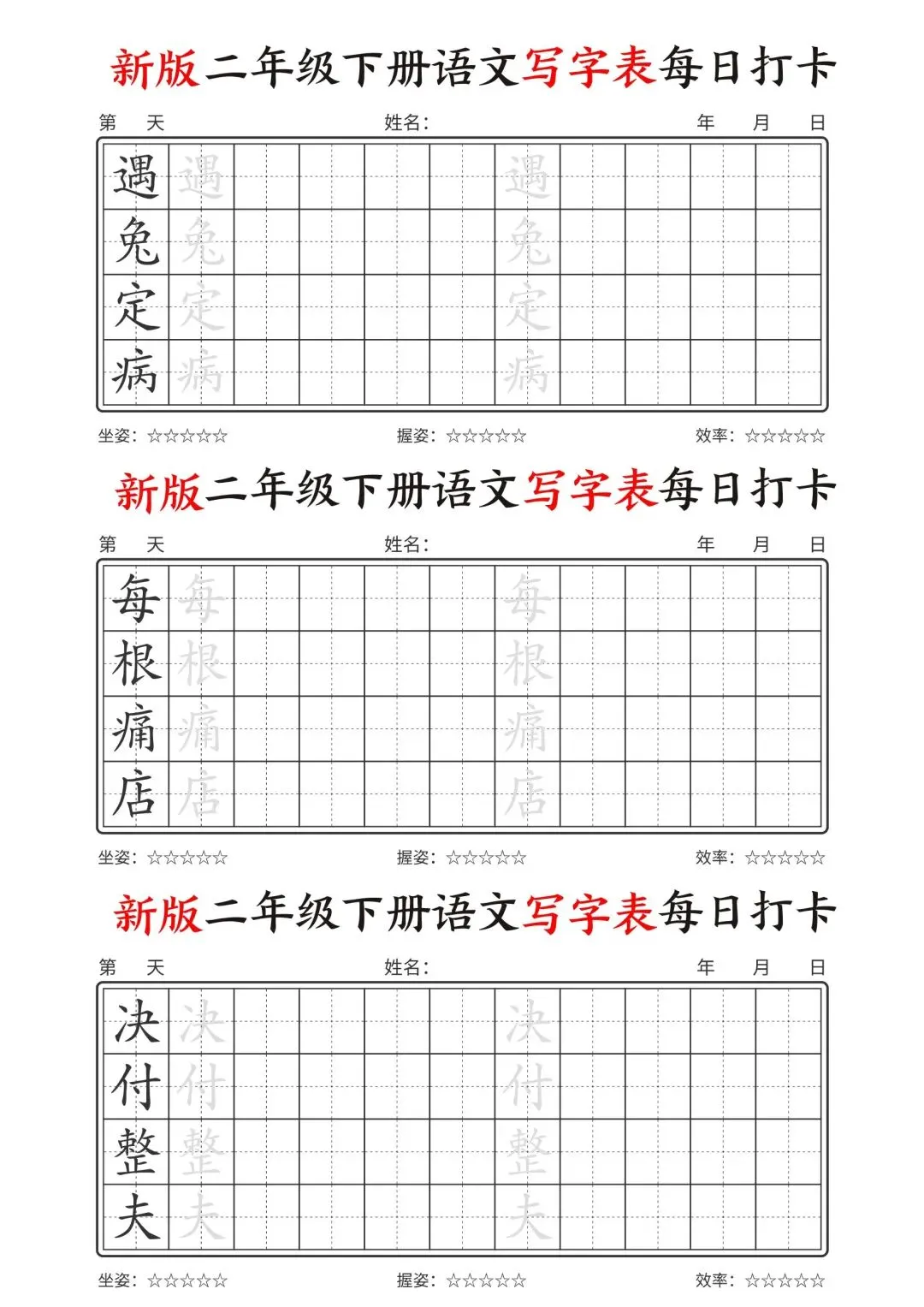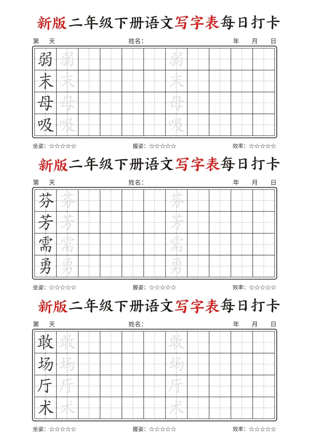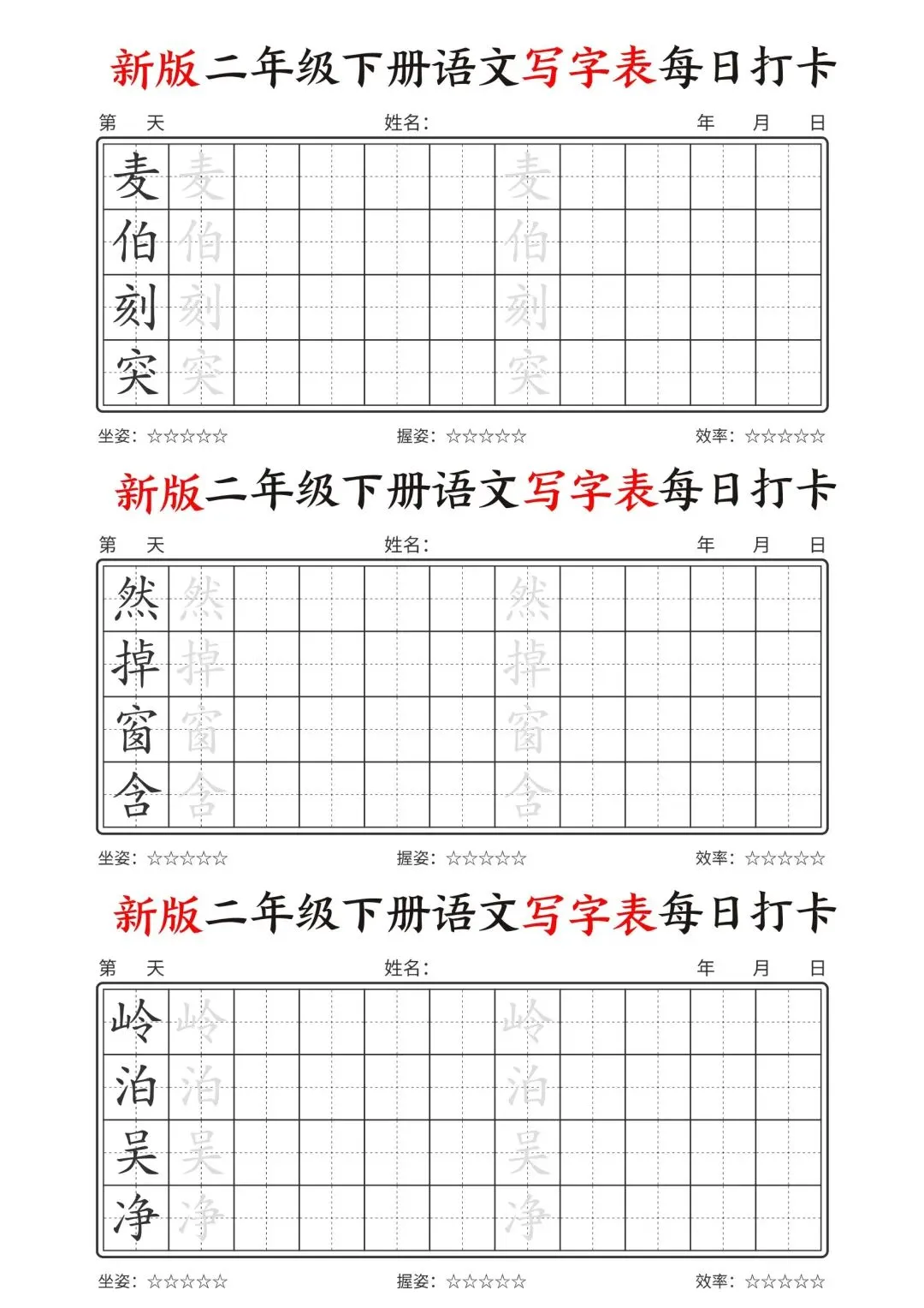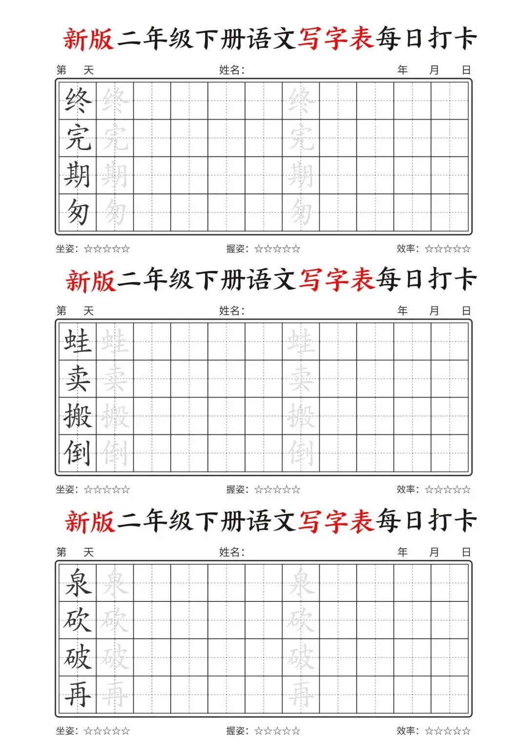 新版二年级下册语文写字表每日打卡,电子版可下载免费