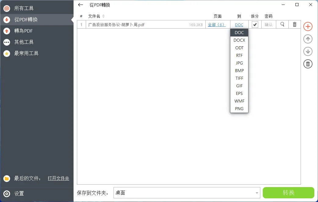 “从 PDF 转换”,也就是将 PDF 文件转换为其他格式文件,支持转换的格式有 Word、JPG、DOCX、RTF、ODT、BMP、PNG、TIFF 以及 OCR 识别。