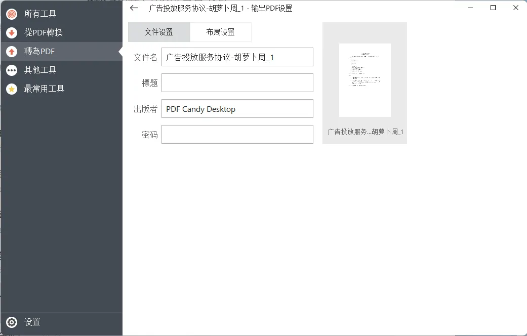 在输出的 PDF 设置项里,可以自定义设置输出文件的文件名、标题、出版社、密码。