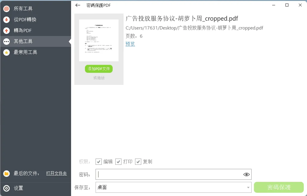 有部分 PDF 因为涉及版权或者私密等原因,需要限制编辑、打印、复制的权限,那么建议使用密码对 PDF 进行保护,也就是加密。