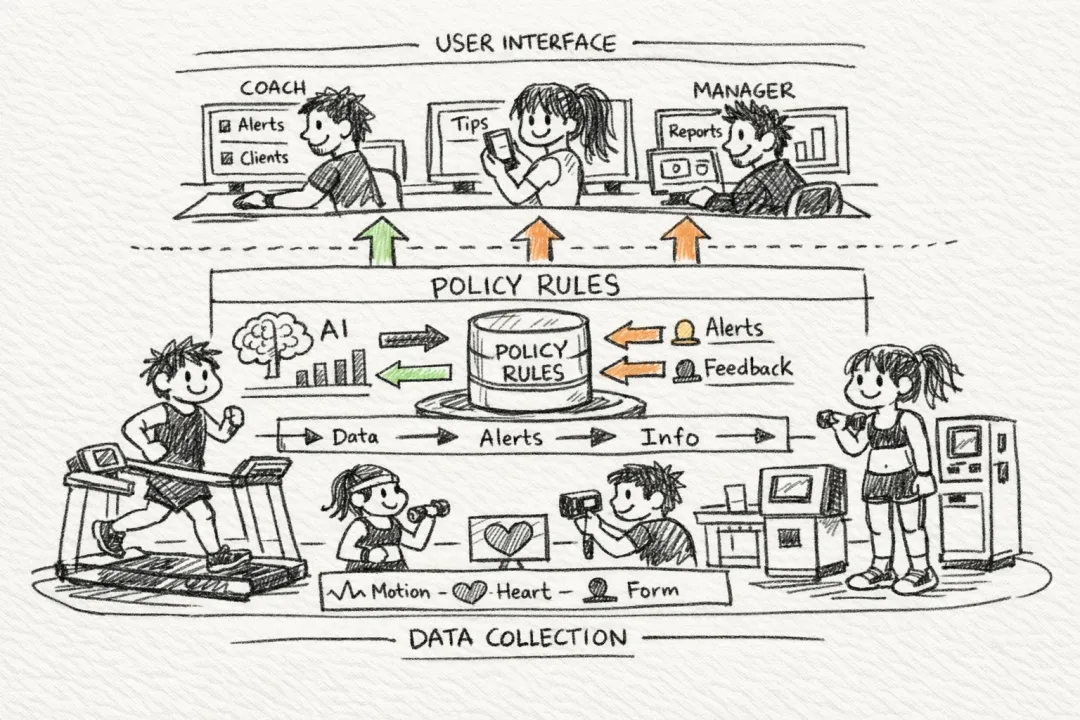 第二层是决策与展示层(Decision & Presentation Layer)。模型在规则约束下做解释、预测与建议,再把结果映射成适合当前人的展示形态:教练看到的是留存风险和干预建议,会员看到的是今天可执行的训练计划,店长看到的是排班和坪效预警。界面可以不同,但底层决策链路必须同源、可追踪、可回放。
