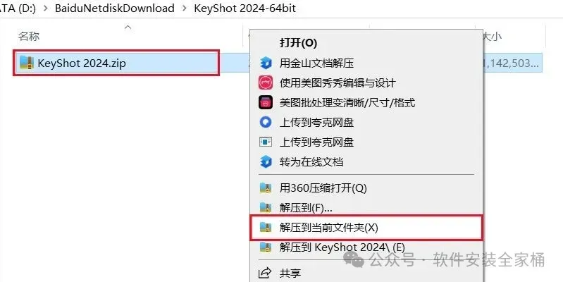 1.打开下载的Keyshot软件安装包,鼠标右击压缩包选择【解压到当前文件夹】。