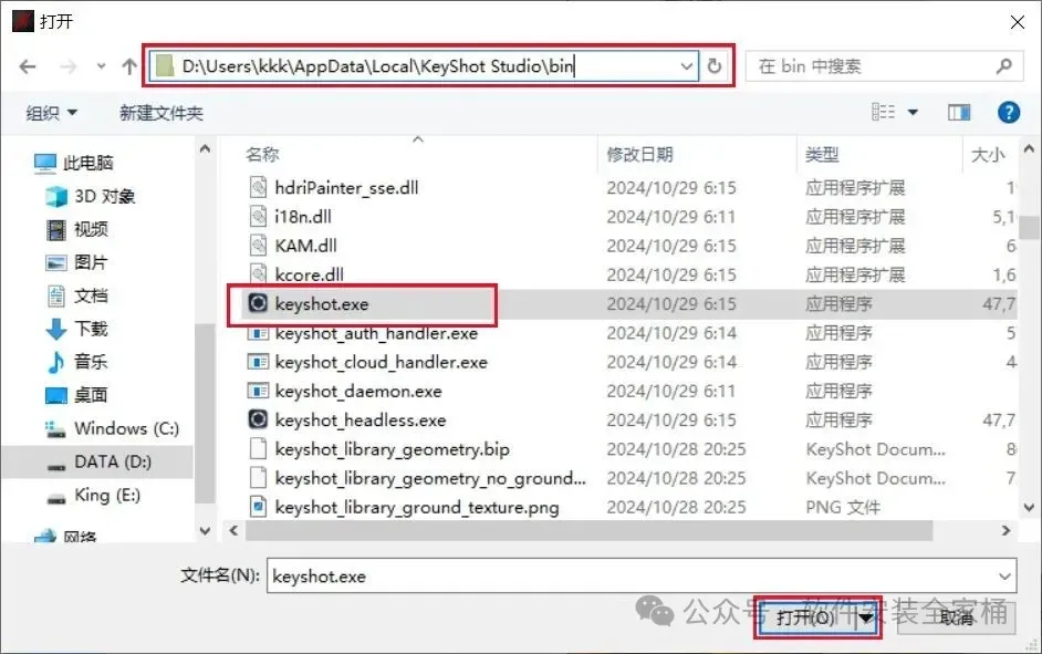 17.打开软件的安装文件夹。然后打开【bin】文件夹。找到并选中【keyshot】文件,然后点击【打开】。