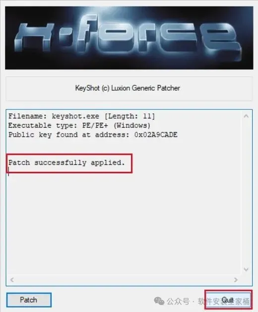 18.注册机中显示【Patch auccessfully applied】,点击【Quit】关闭注册机。