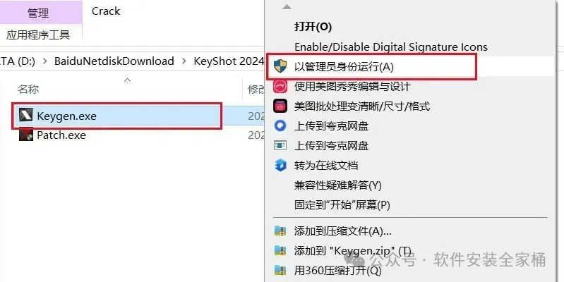 19.返回到解压的【Crack】文件夹中,鼠标右键【keygen】注册机,选择【以管理员身份运行】。
