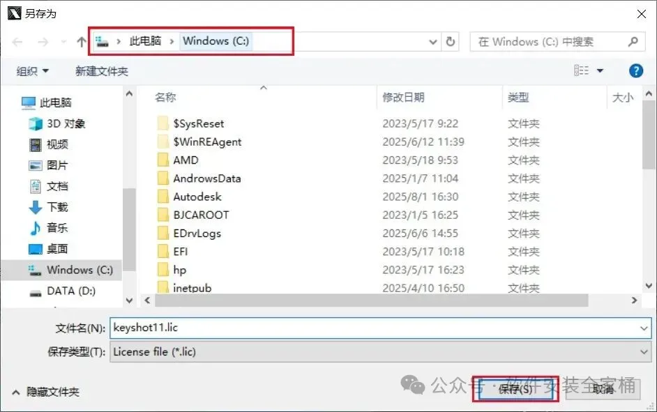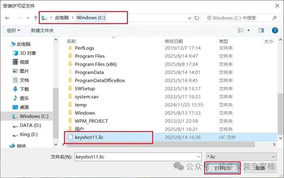 28.打开系统C盘。在C盘中找到【keyshot11.lic】许可证文件,选中后点击【打开】。