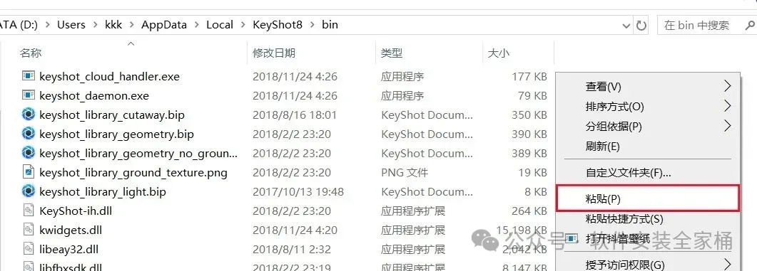 14.在打开的文件夹空白处,鼠标右键【粘贴】刚才复制的keyshot文件。