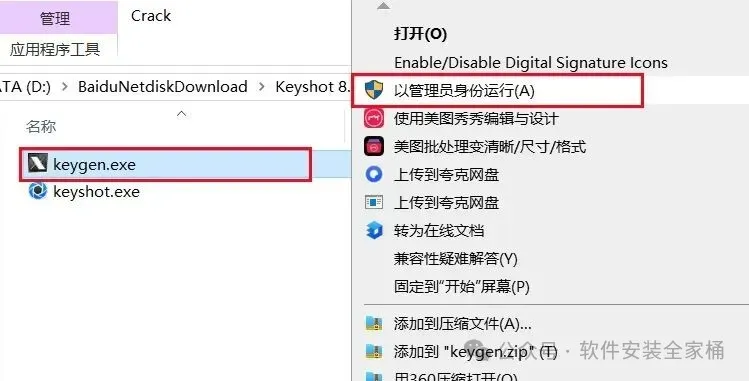 16.返回到【Crack】文件夹中,鼠标右键【keygen】注册机,选择【以管理员身份运行】。