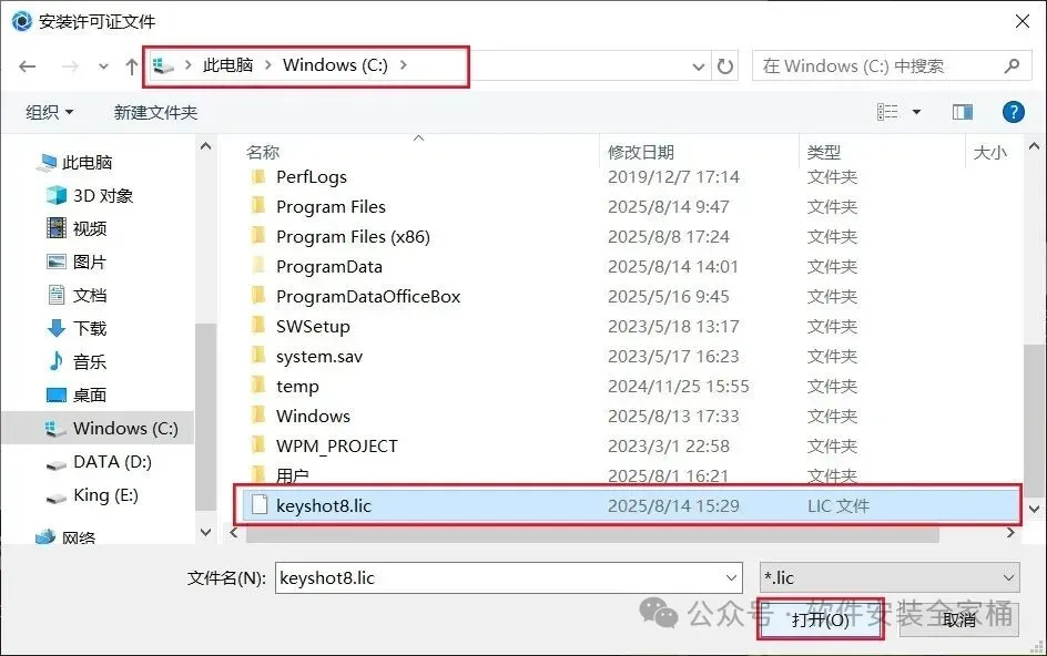 23.打开系统C盘。在C盘中找到【keyshot8.lic】许可证文件,选中后点击【打开】。
