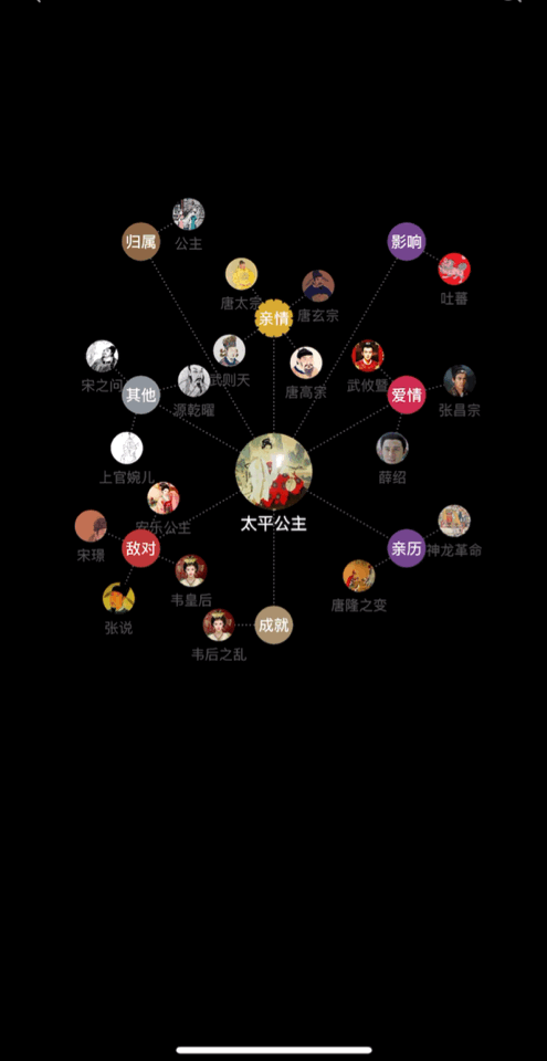 然后点击“太平公主”还能出现她的介绍和生平的大事件。 再点击其他 相关的人物或者事件,也会有拓展的历史知识。
