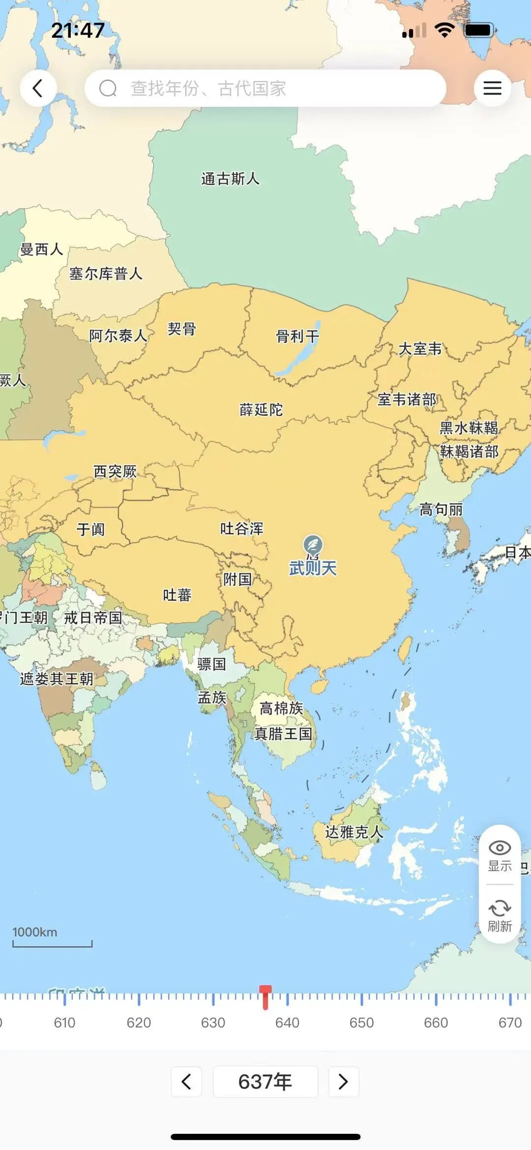 比如:输入637年,就能看到世界的版图划分,还能看到武则天、王绩这样的相关历史人物。