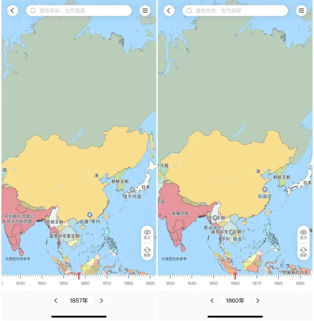 比如:对比一下1857年和1860年,清朝的版图就有变化。