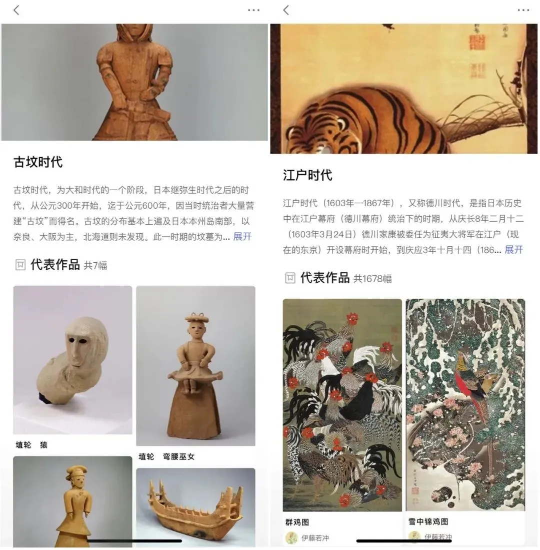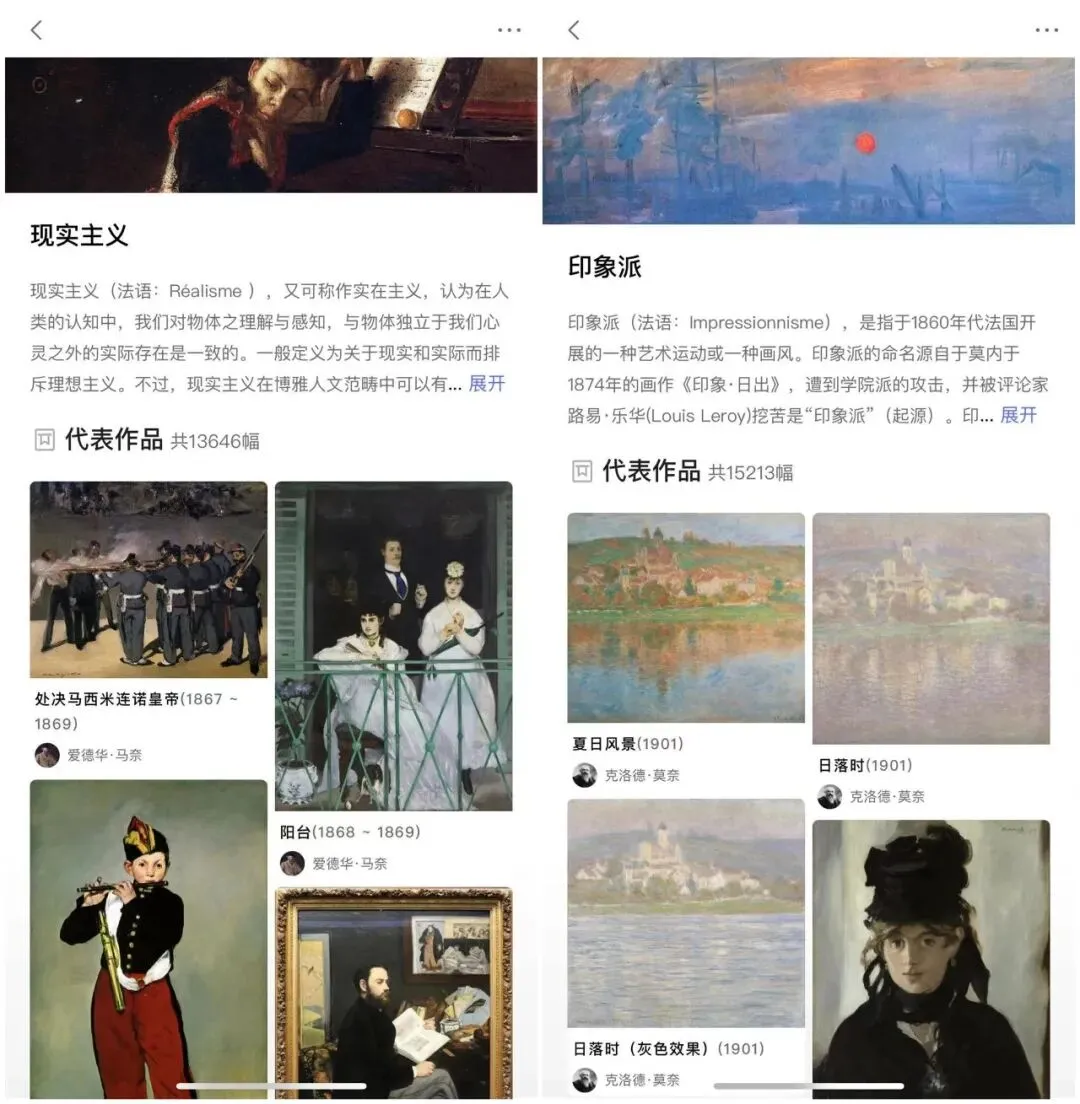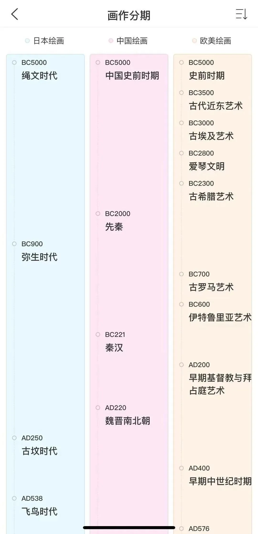 而“全画作”里面,有不同的分类,像我这样的小白爱好者,就觉得简直太棒了,比如这个分期 ,就能让我把绘画流派的发展时期对照起来,每个分期点进去,还有相应的作品。