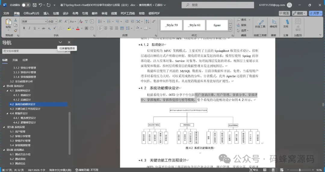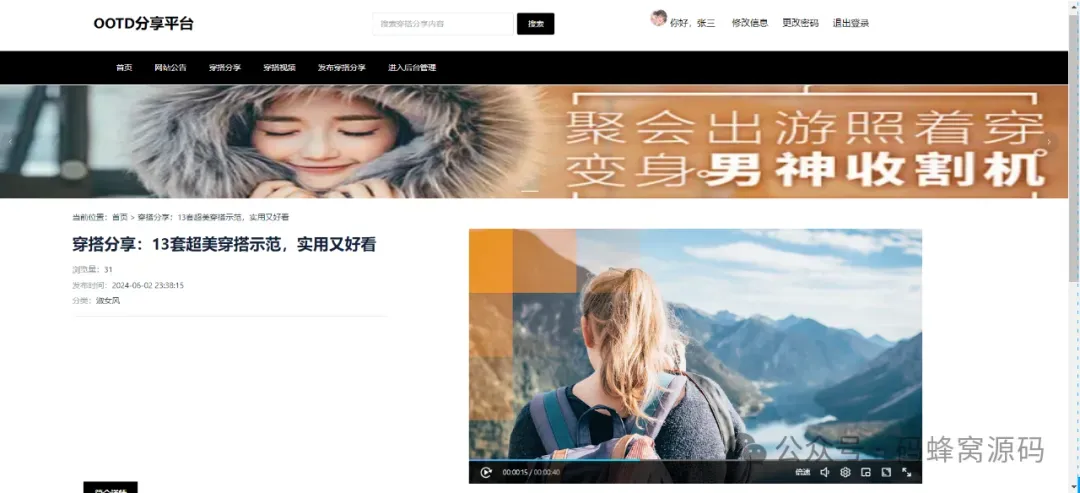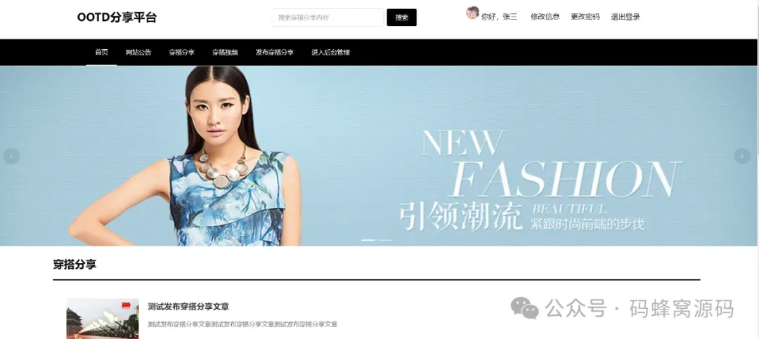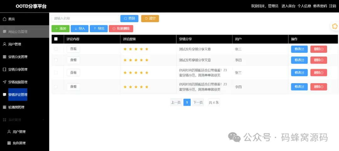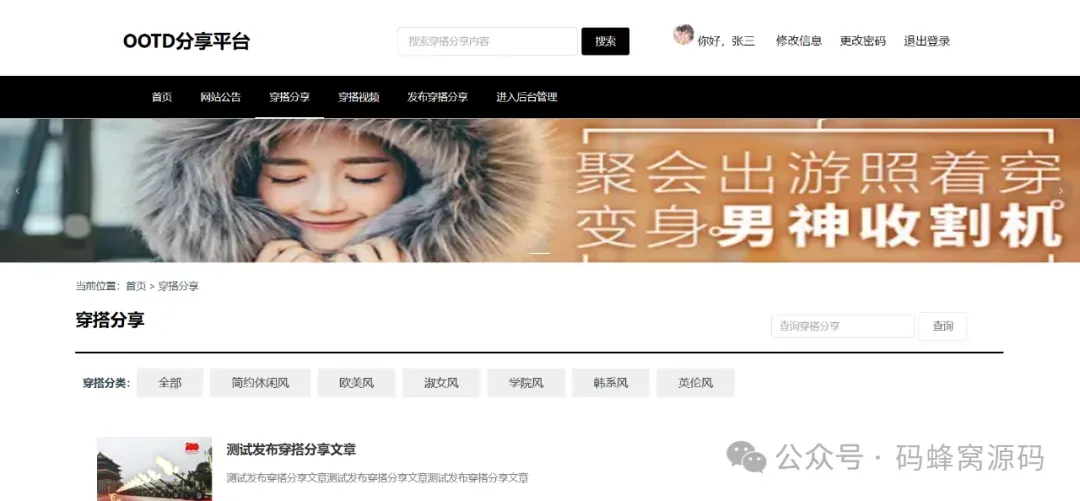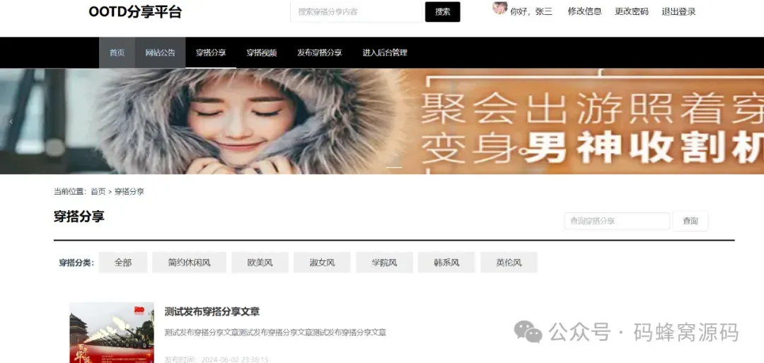 系统主要功能有:用户登录注册、用户管理、穿搭分类管理、穿搭分享、穿搭视频管理、穿搭评价、穿搭热度排行榜等模块。