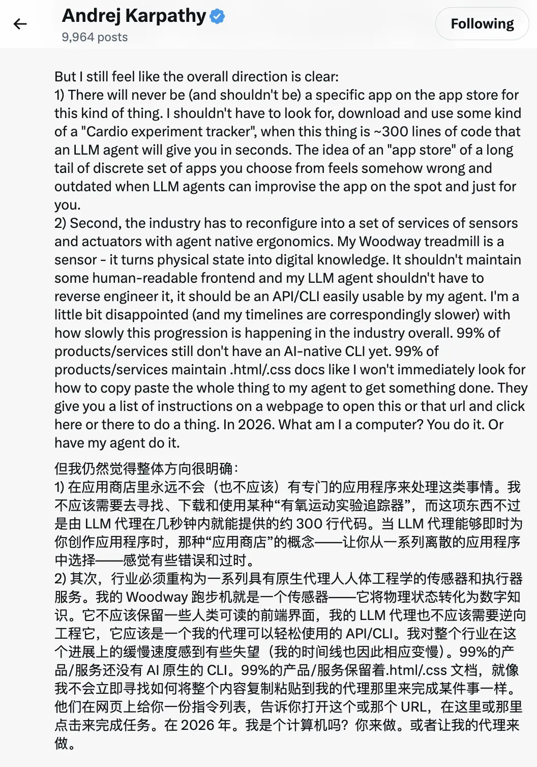 “99% 的产品和服务仍然没有 AI 原生的 CLI。99% 的产品和服务仍然维护着 .html/.css 的文档,好像我不会第一时间把内容复制粘贴给我的 Agent 去完成任务似的。”