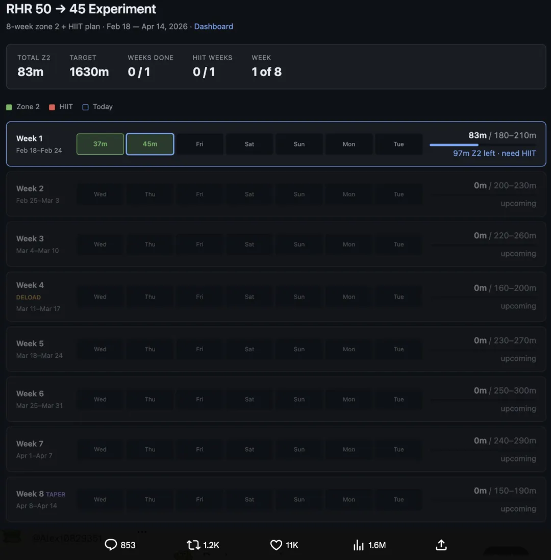 一般人遇到这种需求,大概率是去应用商店搜“Cardio Tracker”之类的 App。但 Karpathy 另辟蹊径——没请开发者,也没下载现成的 App;而是 直接用一个 AI Agent,临时做了一个专门追踪这次训练计划的仪表盘。