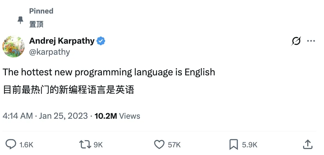 其实,这早已埋下了伏笔。Karpathy 于 2023 年写的“名言”:“目前最热门的新编程语言是英语”,现在还挂在他主页置顶。