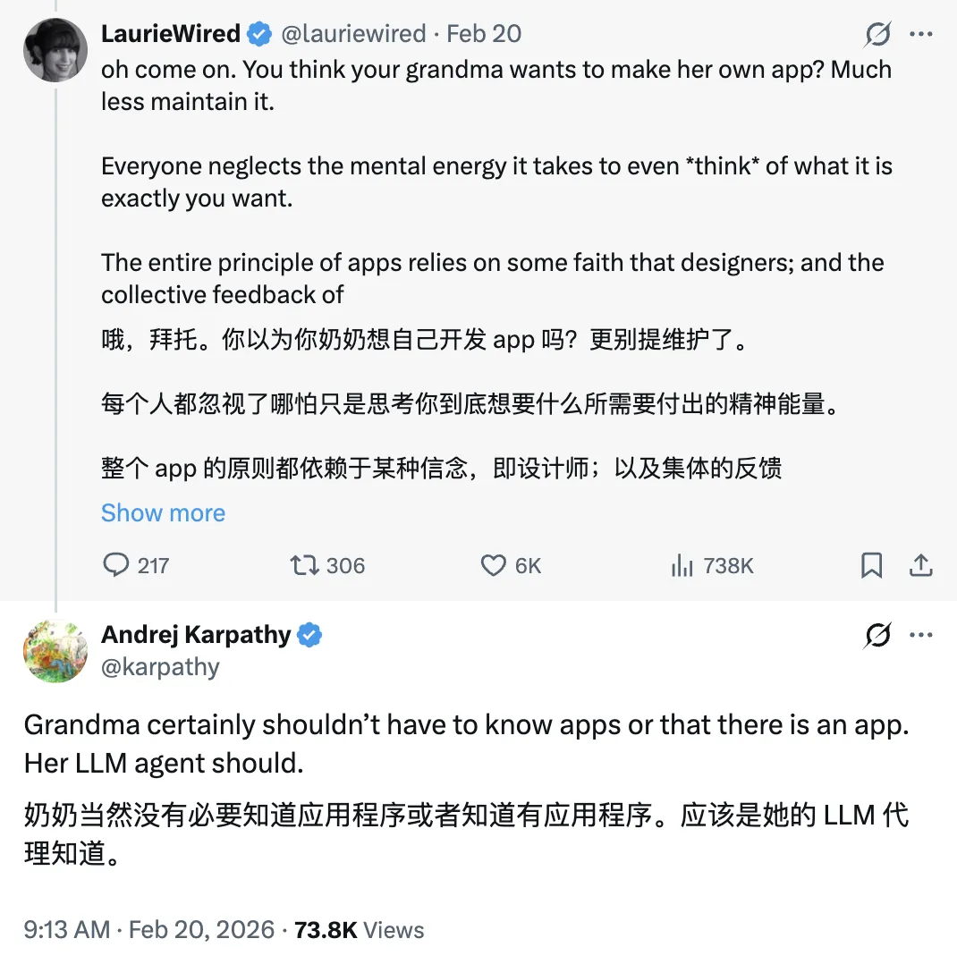 Karpathy 回复道:“奶奶当然没有必要知道应用程序或者知道有应用程序。应该是她的 LLM 代理知道。”