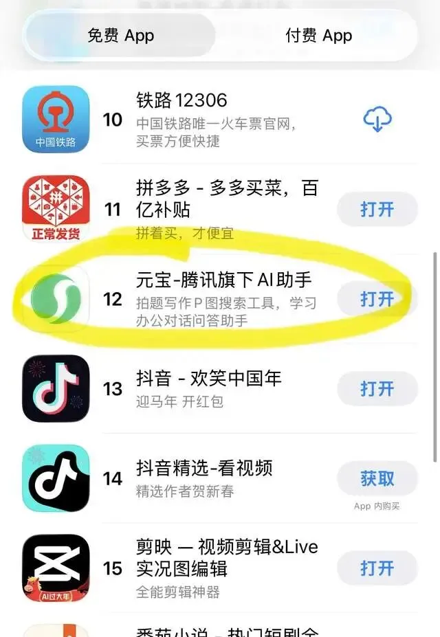 红包一停情感归零?腾讯元宝跌出App Store免费榜前十