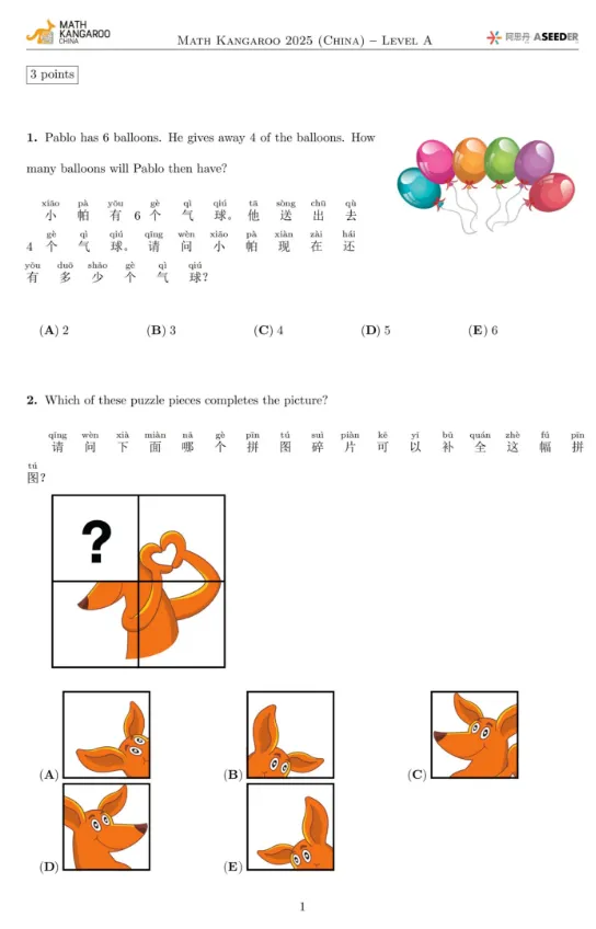 袋鼠数学竞赛等级A-Level 1