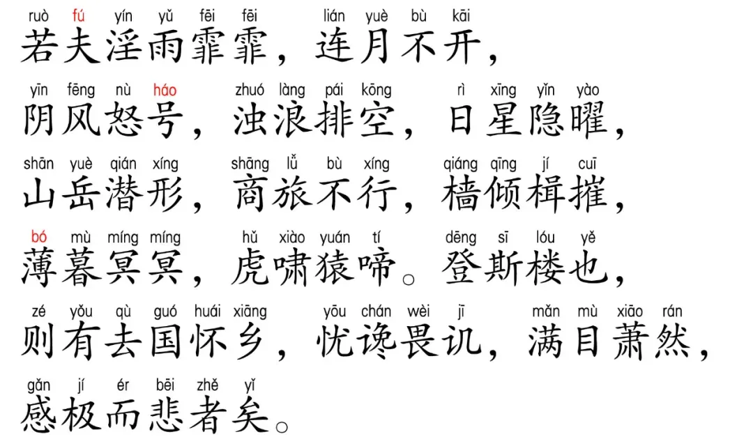 若夫淫雨霏霏,连月不开,阴风怒号,浊浪排空,日星隐曜,山岳潜形,商旅不行,樯倾楫摧,薄暮冥冥,虎啸猿啼。登斯楼也,则有去国怀乡,忧谗畏讥,满目萧然,感极而悲者矣。