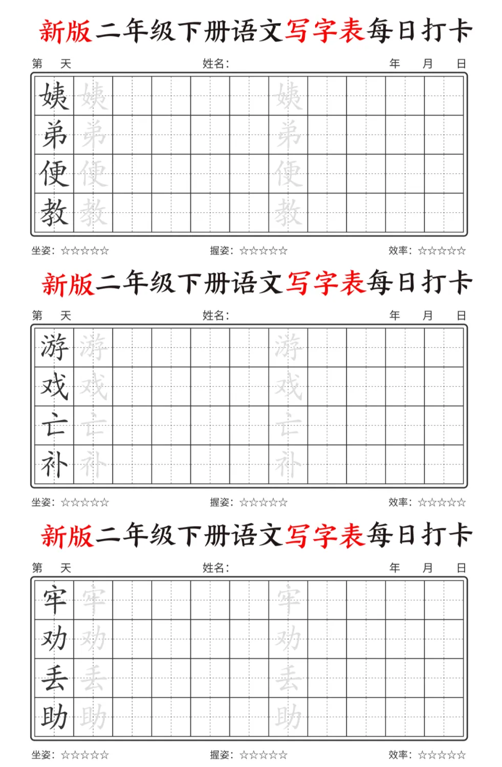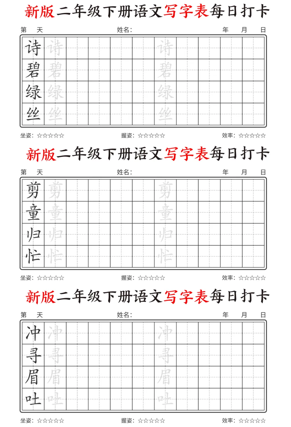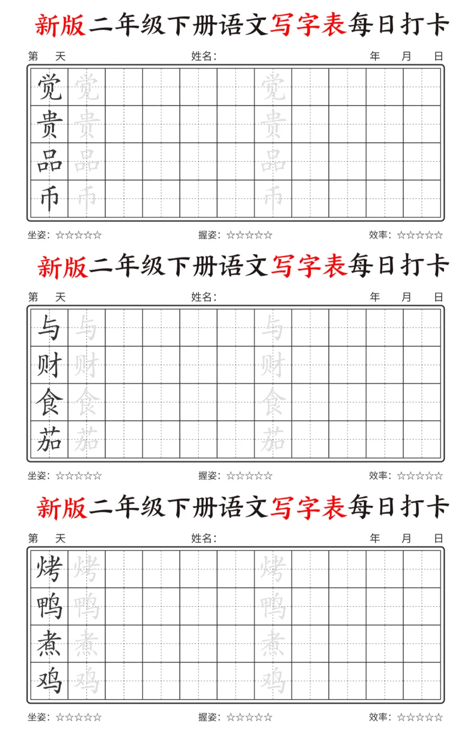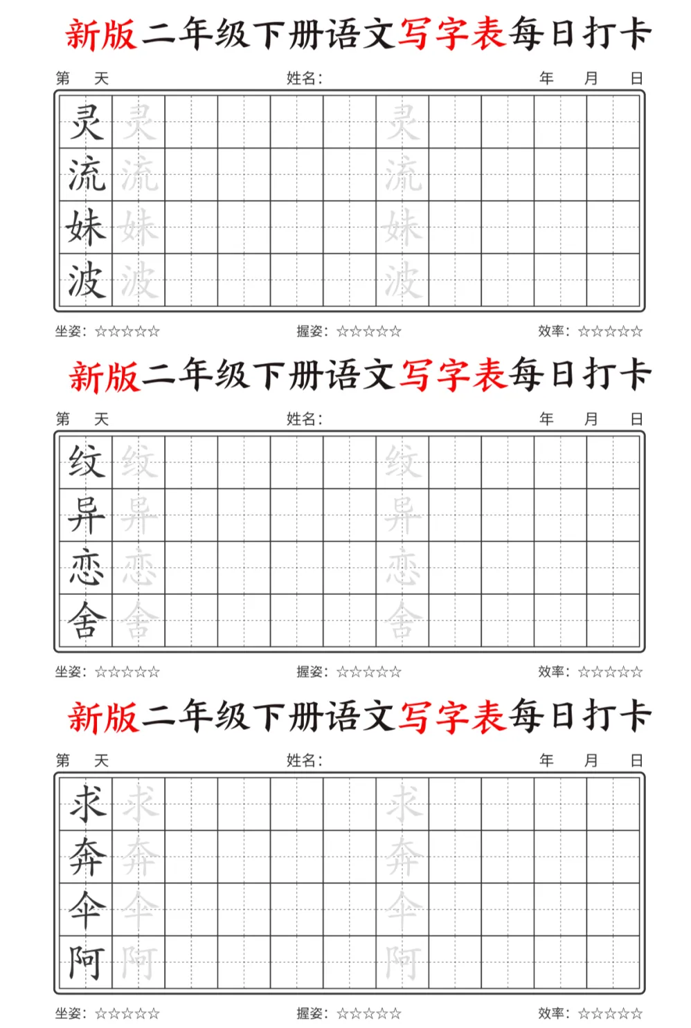 今天为大家分享最新版二年级下册语文【写字表】,每个字都预留了描红和书写的位置,还贴心地标注了坐姿、握姿和效率评分每天一页,既能练字又能预习,让孩子开学不慌张。强烈推荐给各位同年级的宝妈!💪