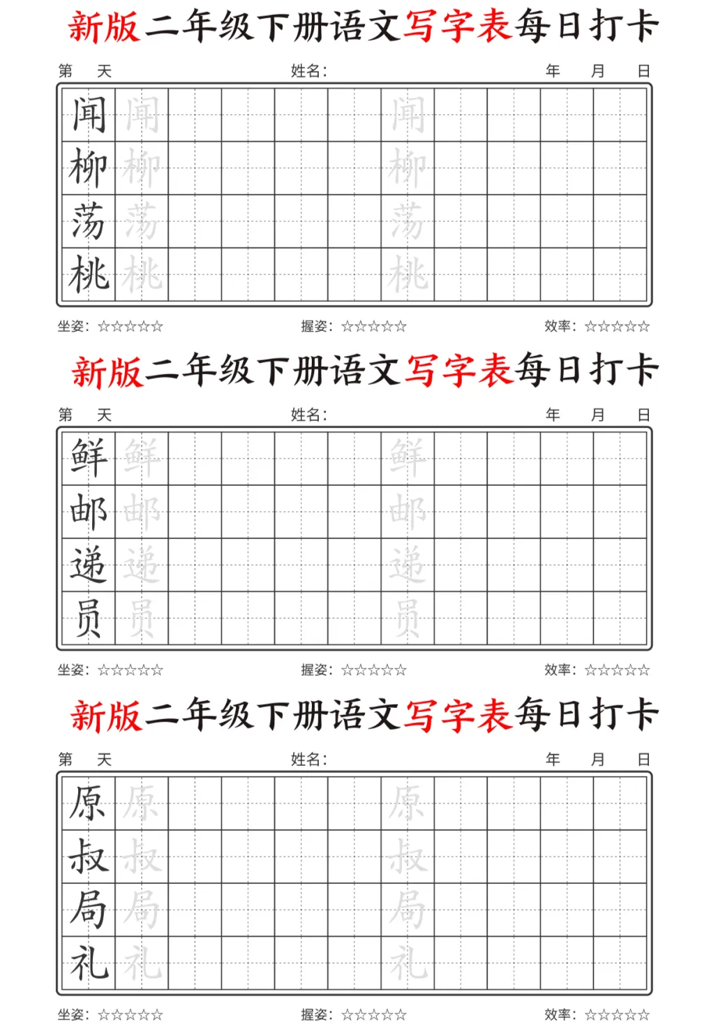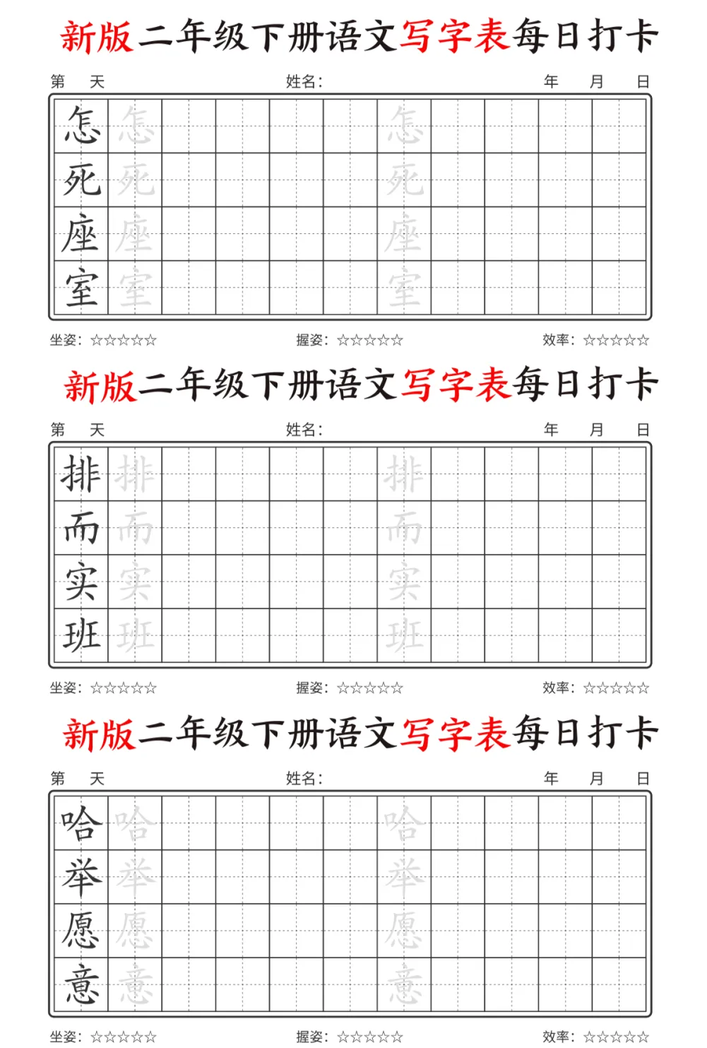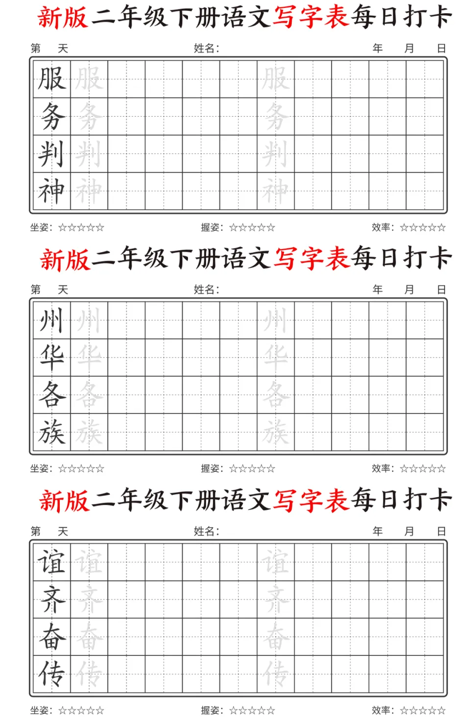今天为大家分享最新版二年级下册语文【写字表】,每个字都预留了描红和书写的位置,还贴心地标注了坐姿、握姿和效率评分每天一页,既能练字又能预习,让孩子开学不慌张。强烈推荐给各位同年级的宝妈!💪