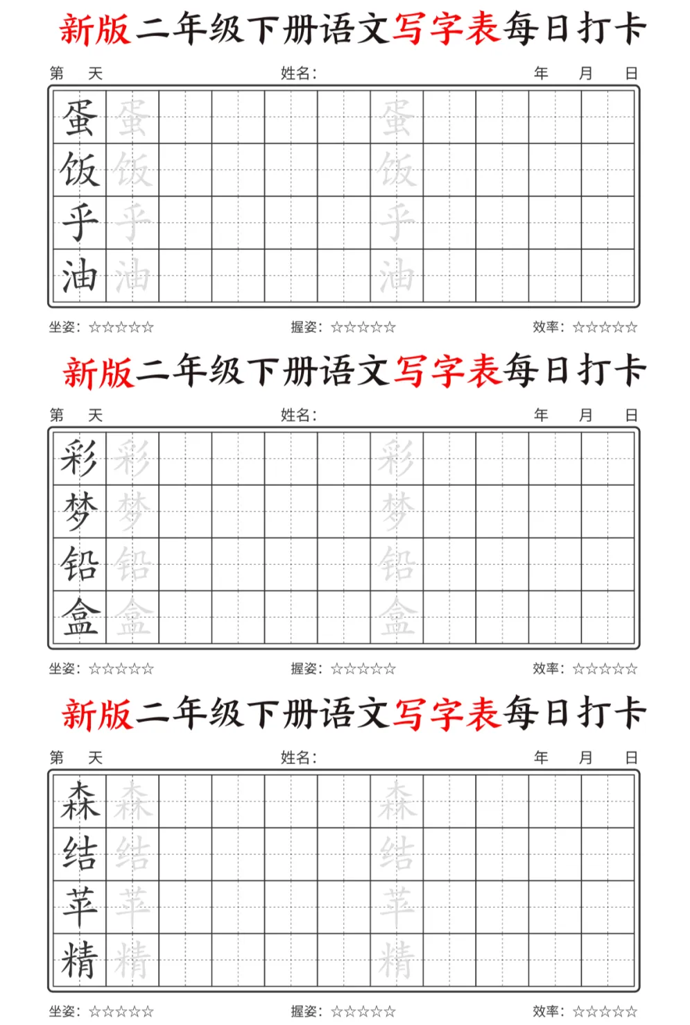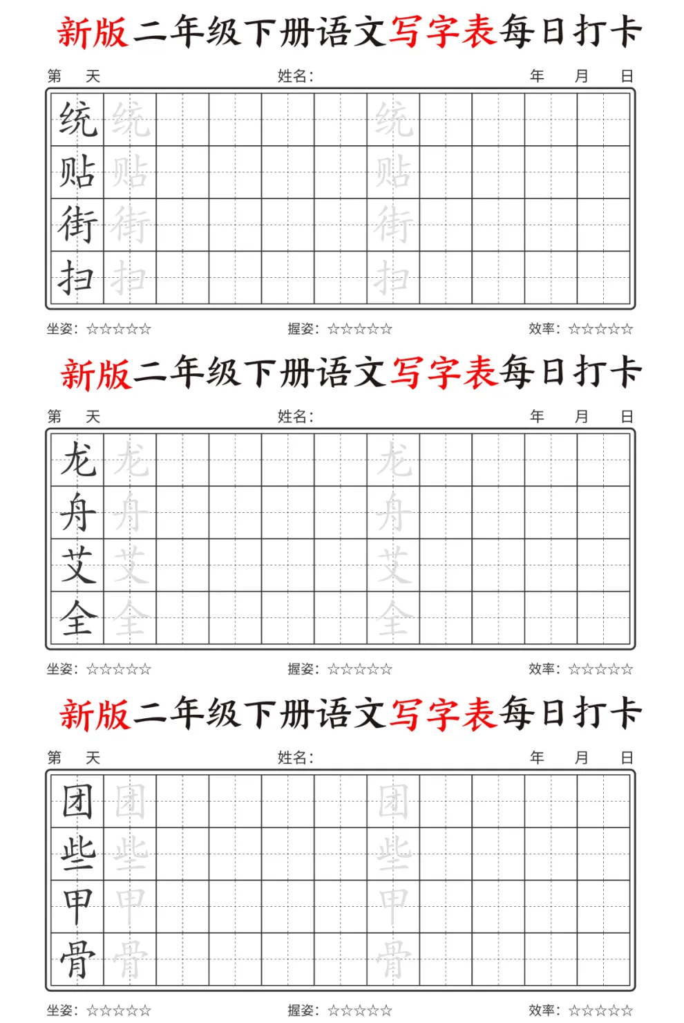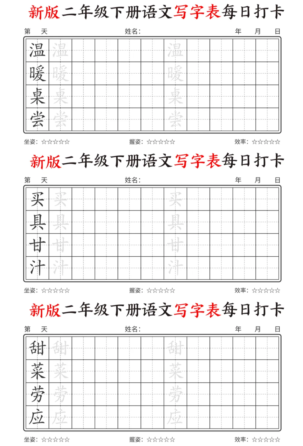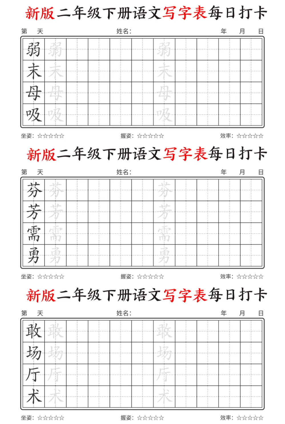 今天为大家分享最新版二年级下册语文【写字表】,每个字都预留了描红和书写的位置,还贴心地标注了坐姿、握姿和效率评分每天一页,既能练字又能预习,让孩子开学不慌张。强烈推荐给各位同年级的宝妈!💪