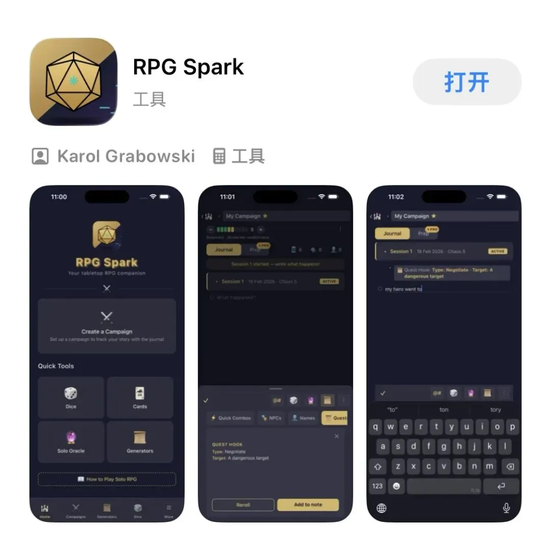 App 名为 RPG Spark,在国内的Appstore就能下载(抱歉我手头没有安卓系统,我不知道安卓系统在哪搜,不过我会提供官网地址:https://rpgspark.app/)。