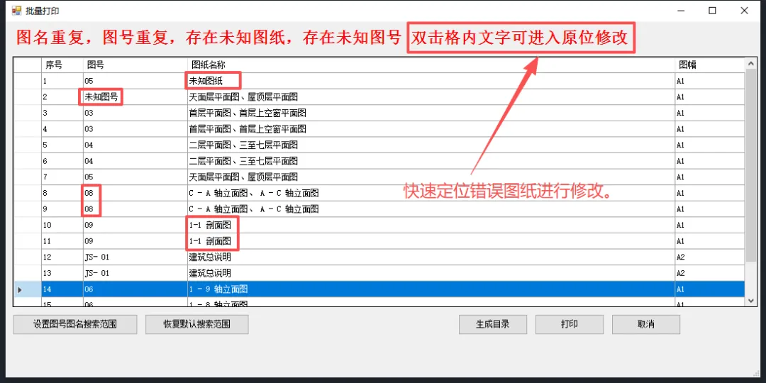 V3版本增加检查图号图名是否有重复漏缺的功能,提出警告信息,双击错误的图号图纸名称格内可以快速转入该张图纸进行修改。