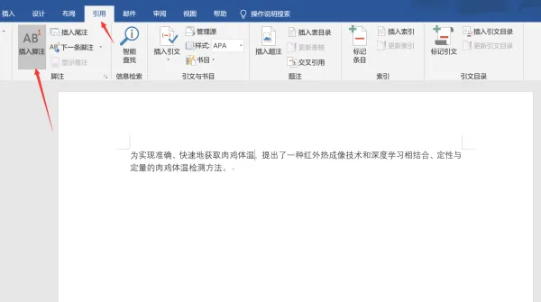 3、点击上方工具栏中的“引用”,然后单击“插入脚注”。