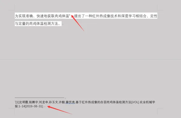 6、观察文字主题和引用的文献处,可以看到相互对应,如此,脚注便添加完成了。