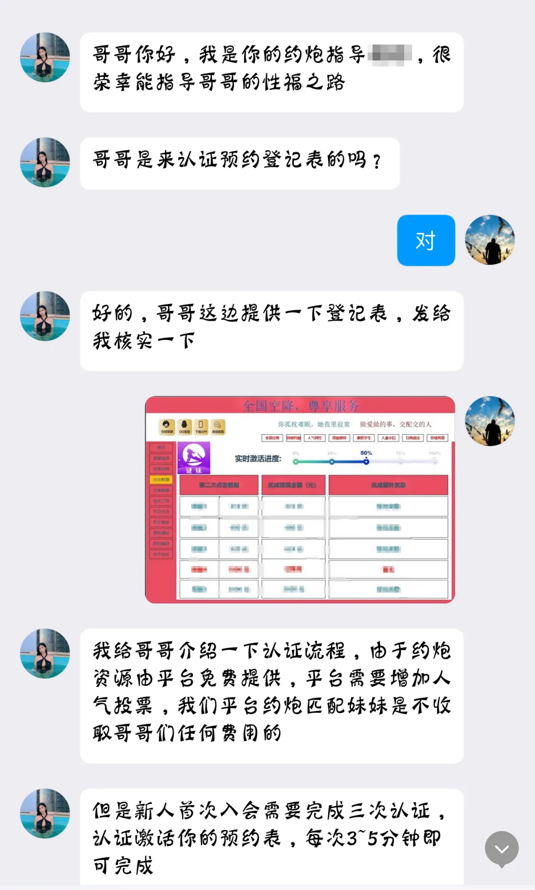 下载完以后,便有“客服”联系受害人,发送大量美女图片引诱受害人,并声称他们在做APP的前期推广,只需要完成认证,就可以和图片中的美女“同城约炮”。