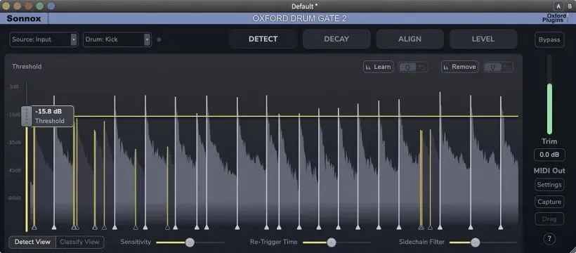 Drum Gate 2 在鼓组打击检测方面取得了显著进步,能够精准检测各种演奏风格和录音场景下的底鼓、军鼓、嗵鼓和踩镲。