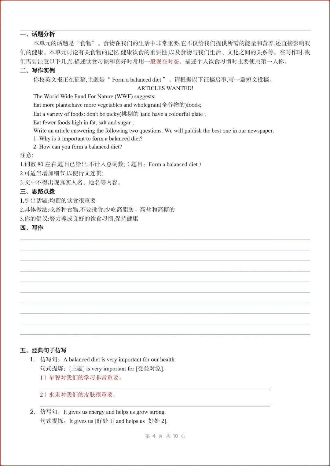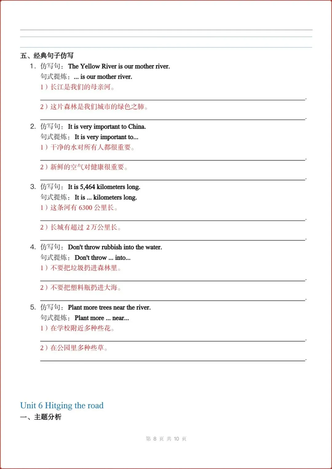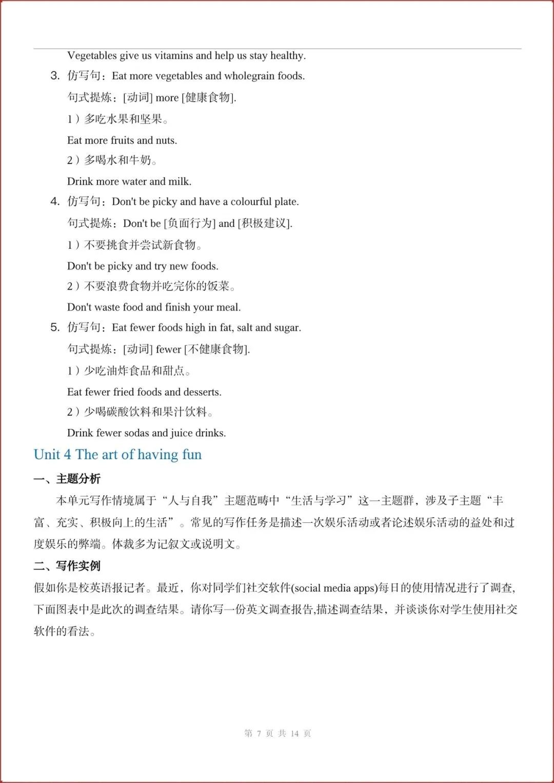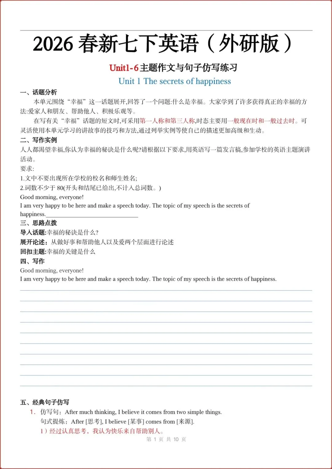 2026春新(外研版)七年级下册英语主题作文与句子仿写练习(Unit1-6全)含答案,电子版可打印!