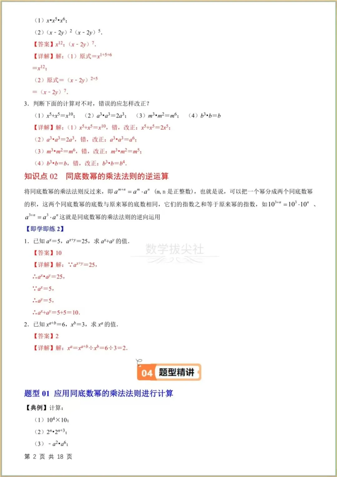 今日分享:👉2026春【苏科版】七年级下册〈数学〉专题练习《同底数幂的乘法》同步练习(2大考点+6大题型),有解析。