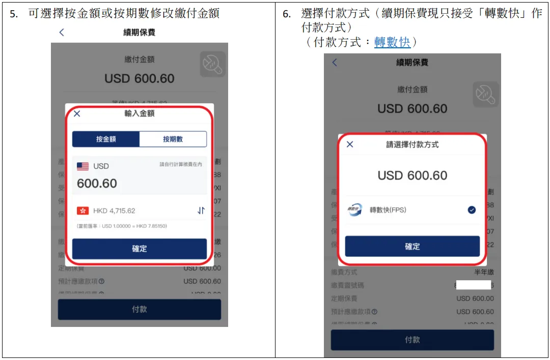 注意:YFLink不支持用网上信用卡支付续期保费,支持用转数快FPS支付续期保费。