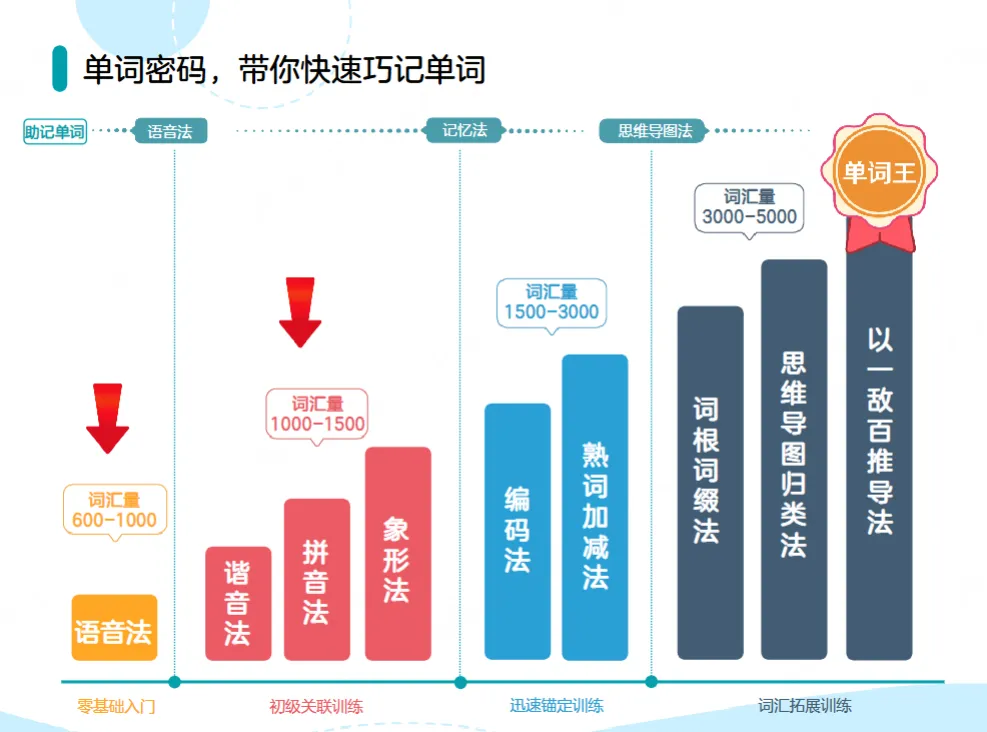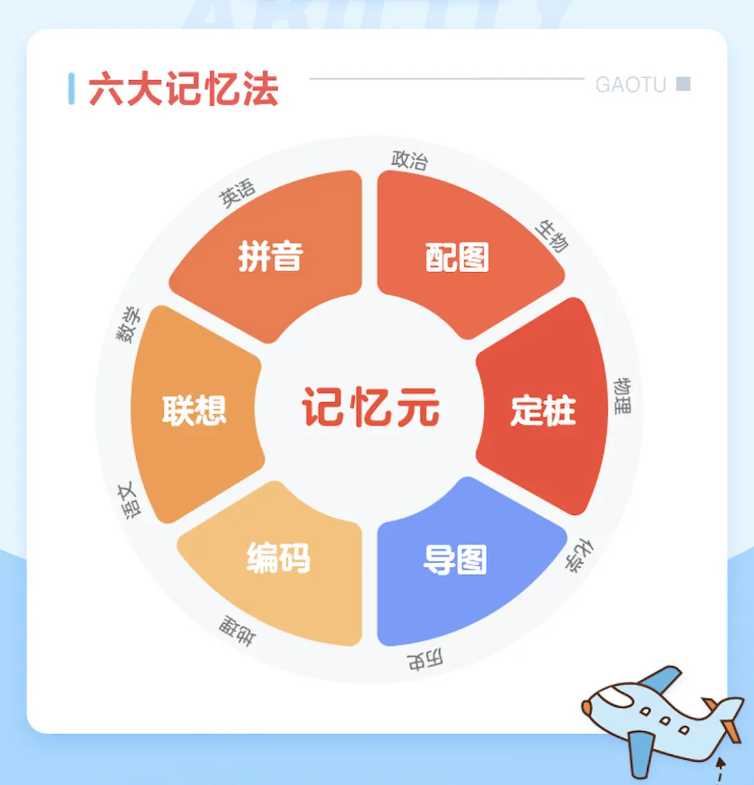 为了提升教学内容与不同阶段孩子的适配性,老师们根据孩子们的智力、发展特点,并结合自己多年的教学经验,整理出了多种科学、高效的学习方法。以六大记忆法为例: