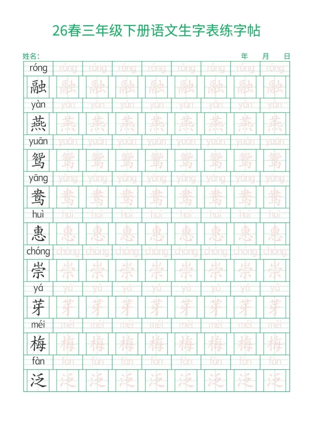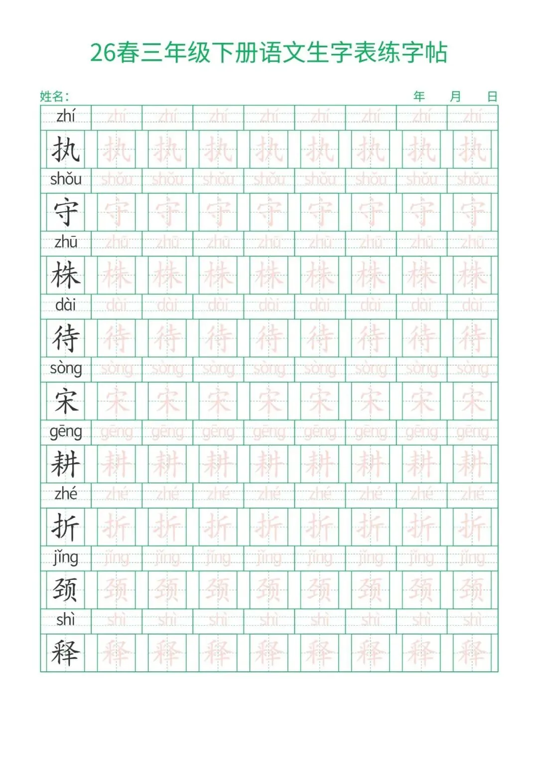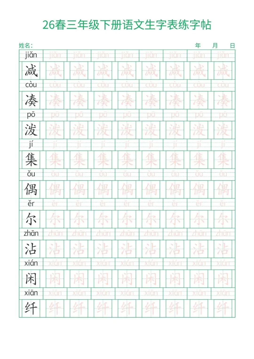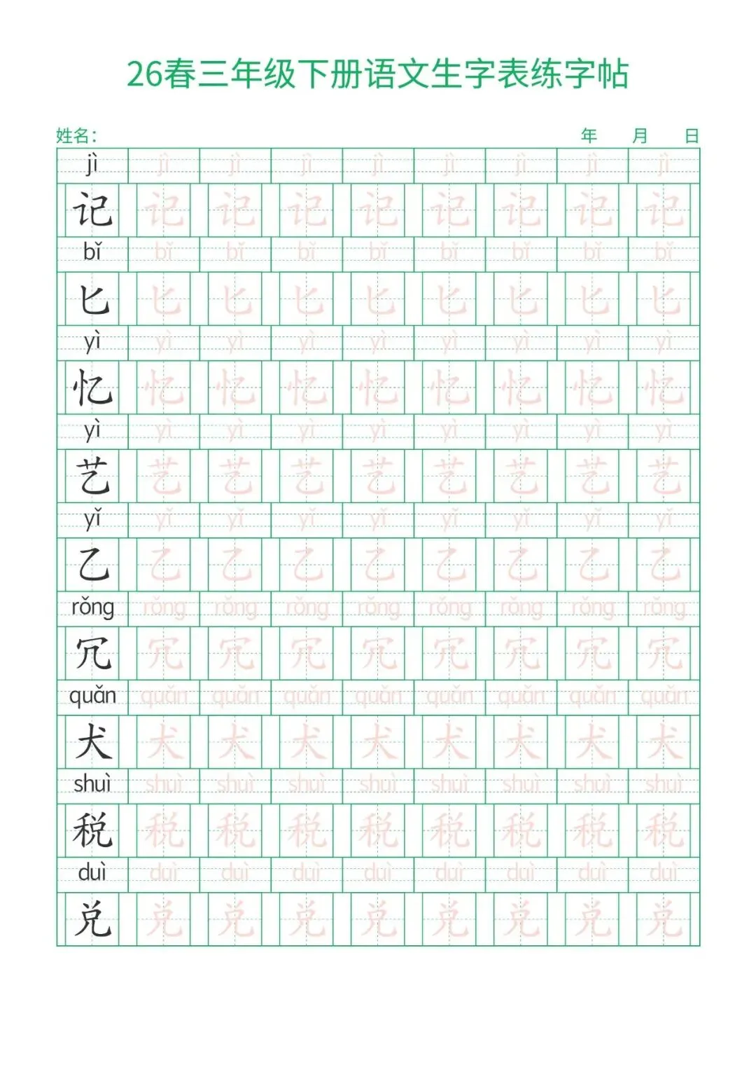 三年级下册语文生字表练字帖,电子版可打印