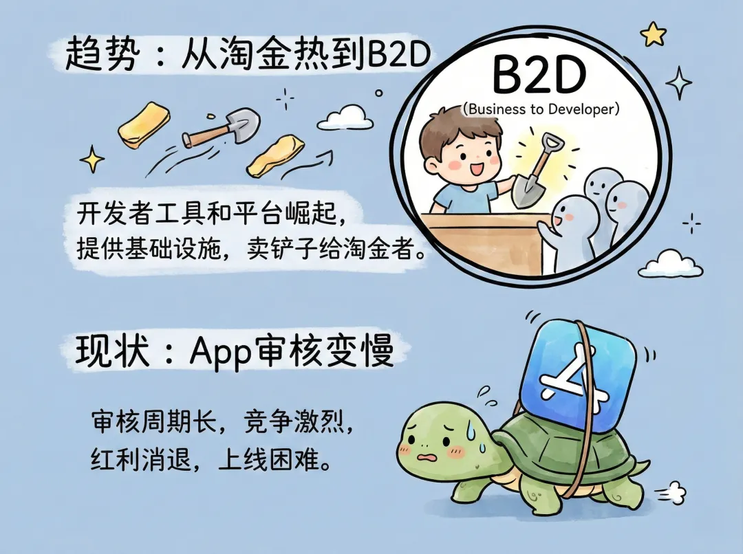 在”人人能做 App”的时代,平台的客户从 C 端用户转向开发者,是一种结构性变化。开发本身越来越便宜,人人都能做,最终的结果是:比起App的实际用户来说,提供给开发者的服务反而是一条出路。特别是分发、审核、增长。